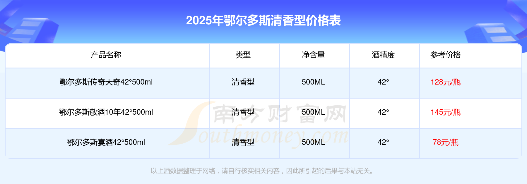 2025年鄂爾多斯清香型酒鄂爾多斯敬酒10年42°500ml、鄂爾多斯傳奇天奇42°500ml、鄂爾多斯宴酒42°500ml等最新價(jià)格如下:
