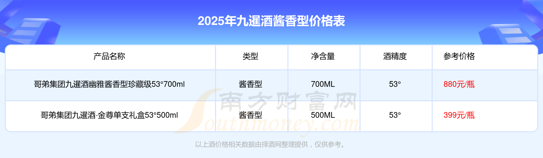哥弟集團(tuán)九暹酒幽雅醬香型珍藏級(jí)53°700ml參考價(jià)880元/瓶、哥弟集團(tuán)九暹酒·金尊單支禮盒53°500ml參考價(jià)399元/瓶。