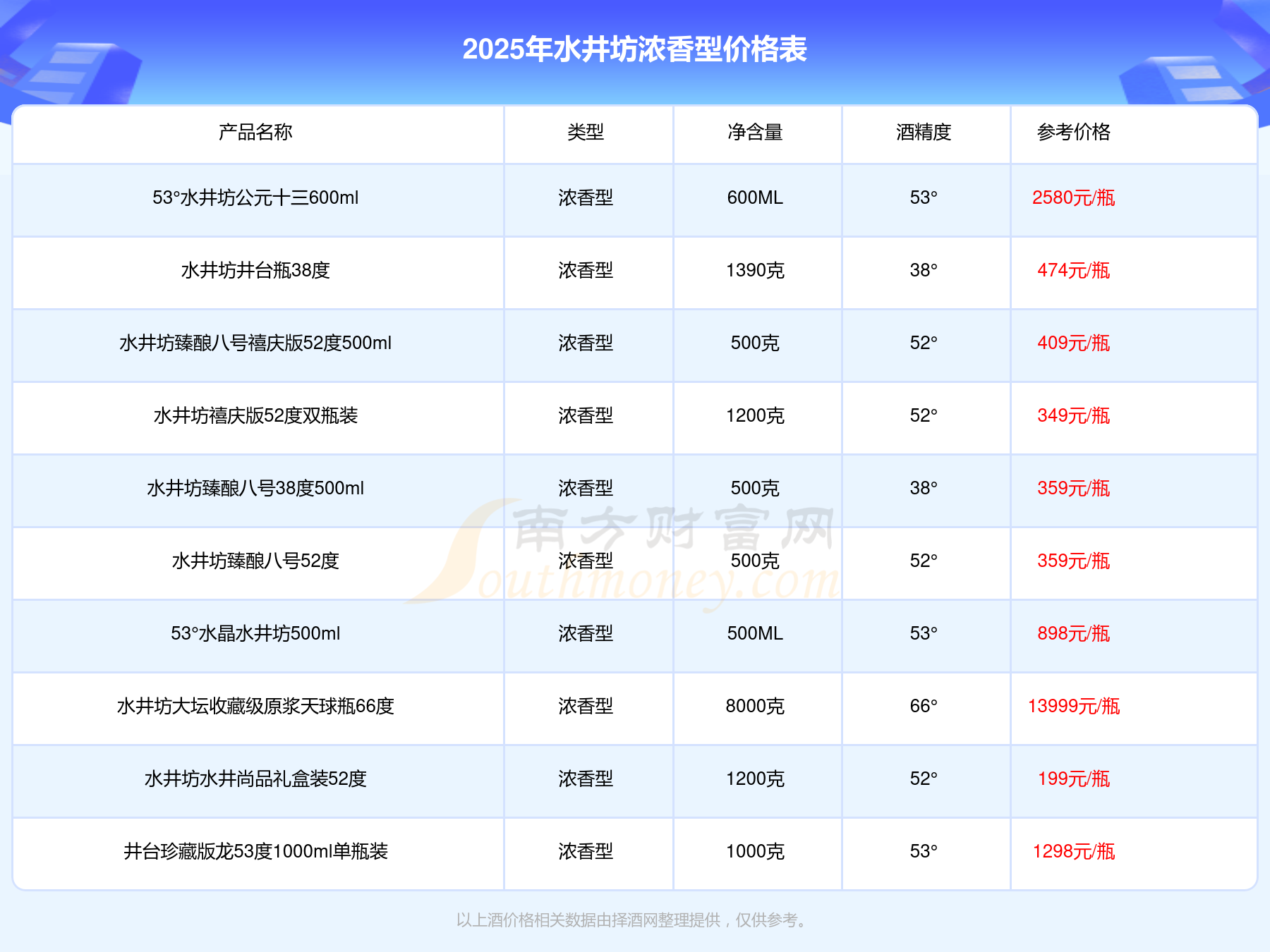 水井坊大壇收藏級原漿天球瓶66度參考價13999元/瓶、水井坊博物館壹號53度雙瓶裝參考價10988元/瓶、53°水井坊公元十三600ml參考價2580元/瓶、水井坊梅蘭竹菊52度濃香型600ml4瓶參考價1999元/瓶、水井坊菁翠52度500ml參考價1650元/瓶。
