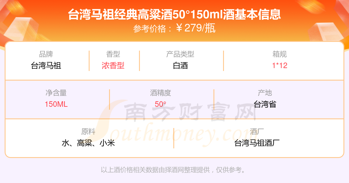 臺(tái)灣馬祖經(jīng)典高粱酒50°150ml基本信息