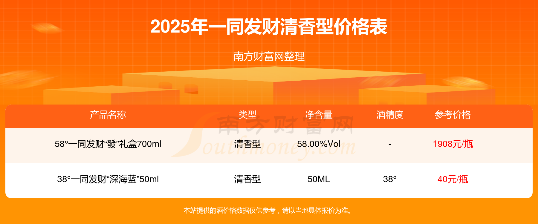 2025年一同發(fā)財清香型酒58°一同發(fā)財“發(fā)”禮盒700ml、38°一同發(fā)財“深海藍(lán)”50ml等最新價格如下: