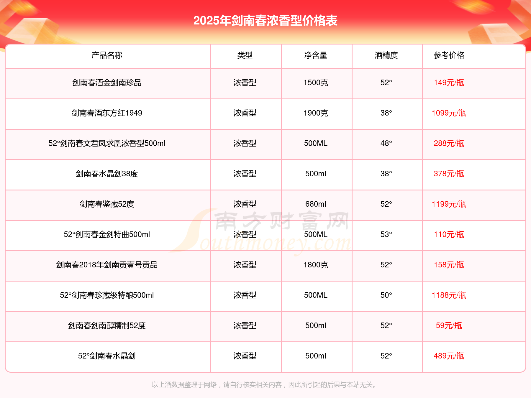 劍南春鑒藏52度參考價1199元/瓶、52°劍南春珍藏級特釀500ml參考價1188元/瓶、劍南春酒東方紅1949參考價1099元/瓶、52°劍南春500ml參考價538元/瓶。