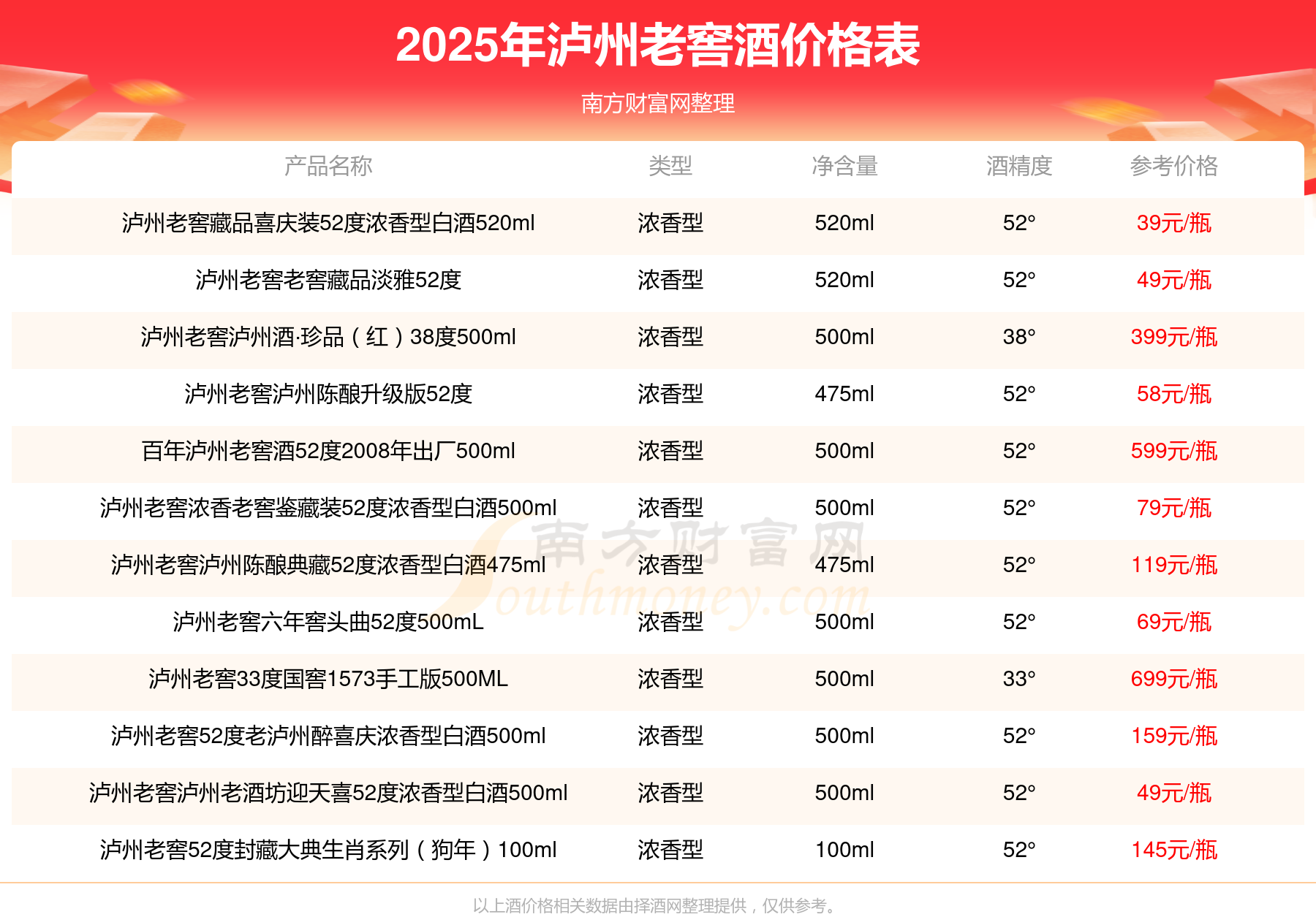 2025瀘州老窖酒最新價(jià)格:瀘州老窖國(guó)窖1573春釀鼠兆豐年E 55度參考價(jià)17999元/瓶、瀘州老窖國(guó)窖1573生命中的那壇酒55度014參考價(jià)9999元/瓶、瀘州老窖國(guó)窖1573春釀鼠兆豐年A 55度參考價(jià)5088元/瓶、瀘州老窖國(guó)窖1573生命中的那壇酒55度013濃香型白酒1000ml參考價(jià)4988元/瓶、瀘州老窖國(guó)窖1573生命中的那壇酒55度009 1000ml參考價(jià)4288元/瓶、瀘州老窖國(guó)窖1573中國(guó)品味52度濃香型白酒500ml參考價(jià)2888元/瓶、瀘州老窖國(guó)窖1573許燎源概念作品58度濃香型白酒1000ml參考價(jià)2680元/瓶。