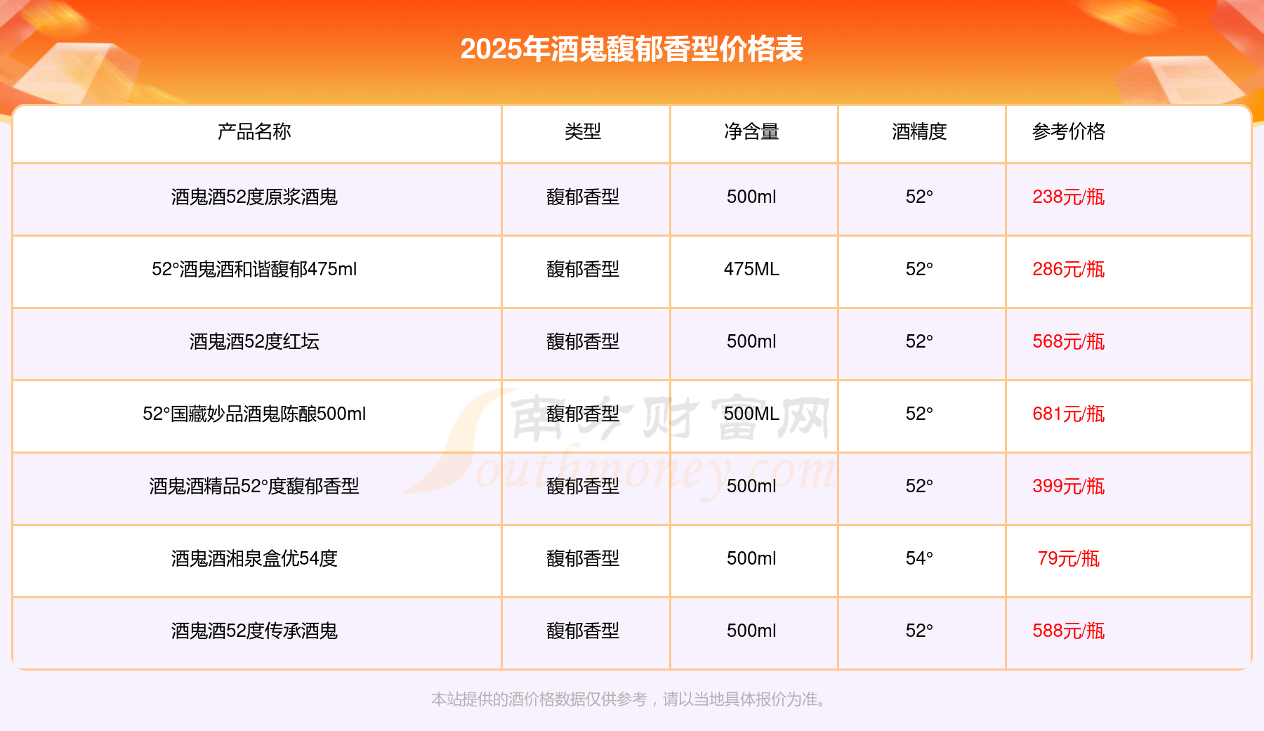 2025年,52°國藏妙品酒鬼陳釀500ml、酒鬼酒52度傳承酒鬼、酒鬼酒52度紅壇、酒鬼酒精品52°度馥郁香型、52°酒鬼酒和諧馥郁475ml等酒鬼馥郁香型酒價格如下: