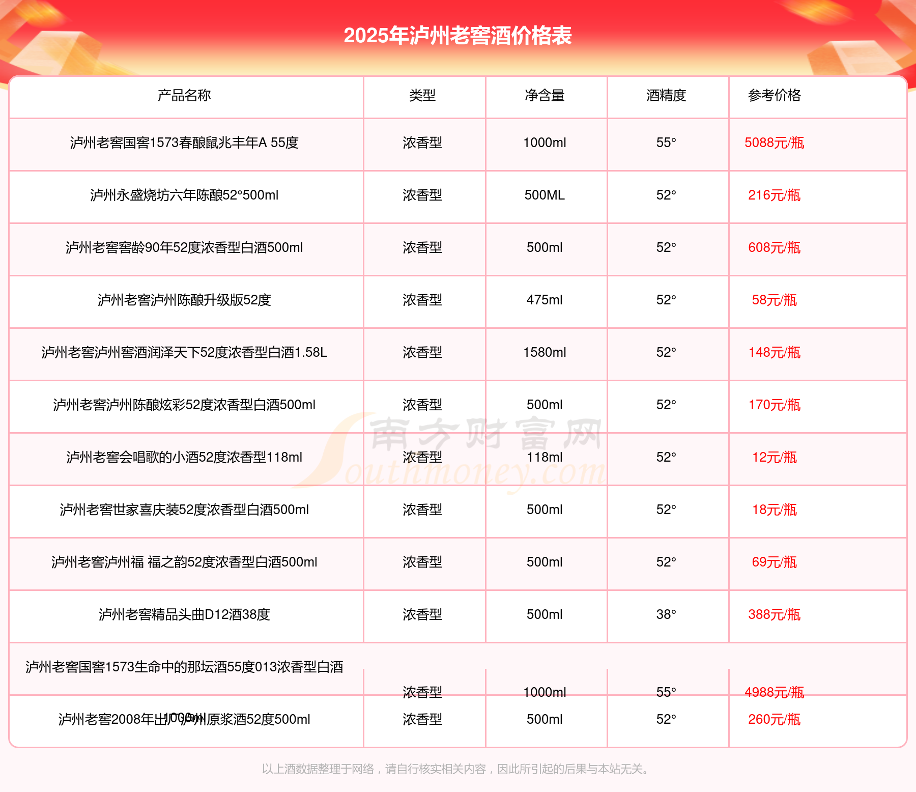 2025年瀘州老窖酒瀘州老窖國窖1573春釀鼠兆豐年E 55度、瀘州老窖國窖1573生命中的那壇酒55度014、瀘州老窖國窖1573春釀鼠兆豐年A 55度等最新價(jià)格如下:瀘州老窖國窖1573春釀鼠兆豐年E 55度參考價(jià)17999元/瓶、瀘州老窖國窖1573生命中的那壇酒55度014參考價(jià)9999元/瓶、瀘州老窖國窖1573春釀鼠兆豐年A 55度參考價(jià)5088元/瓶。