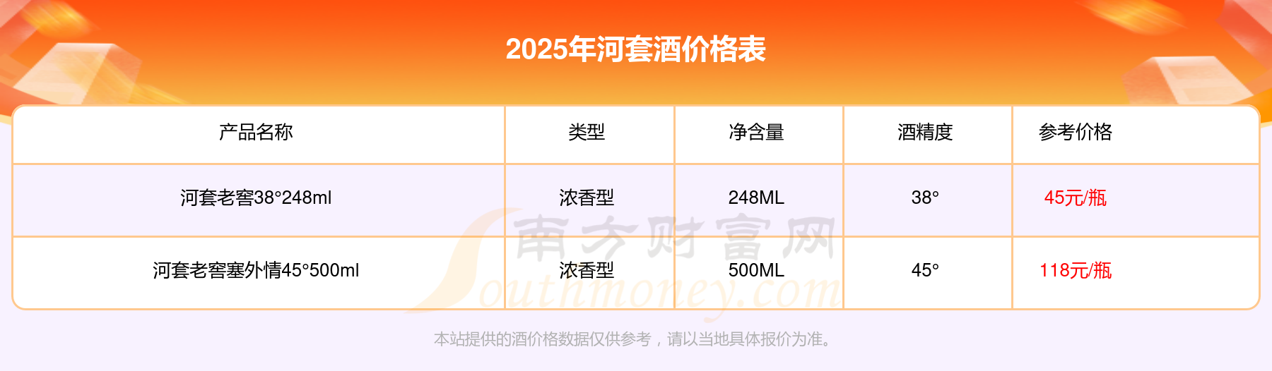 2025年,河套老窖塞外情45°500ml、河套老窖38°248ml等河套酒價(jià)格如下:河套老窖塞外情45°500ml參考價(jià)118元/瓶、河套老窖38°248ml參考價(jià)45元/瓶。