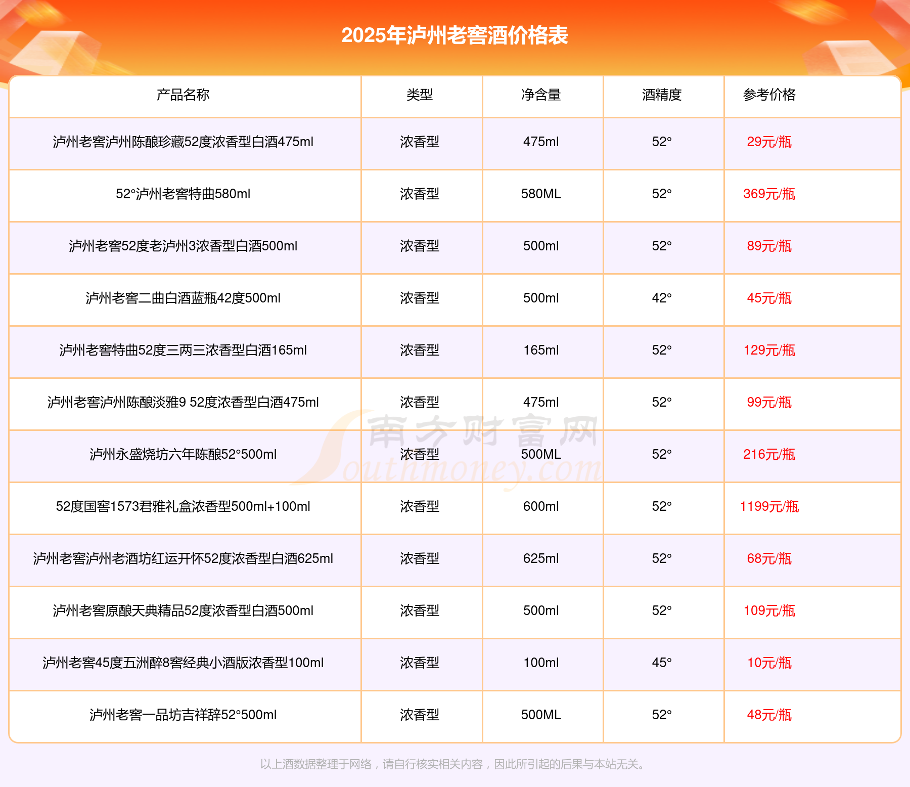 2025年瀘州老窖酒瀘州老窖國(guó)窖1573春釀鼠兆豐年E 55度、瀘州老窖國(guó)窖1573生命中的那壇酒55度014、瀘州老窖國(guó)窖1573春釀鼠兆豐年A 55度、瀘州老窖國(guó)窖1573生命中的那壇酒55度013濃香型白酒1000ml、瀘州老窖國(guó)窖1573生命中的那壇酒55度009 1000ml、瀘州老窖國(guó)窖1573中國(guó)品味52度濃香型白酒500ml、瀘州老窖國(guó)窖1573許燎源概念作品58度濃香型白酒1000ml等最新價(jià)格如下: