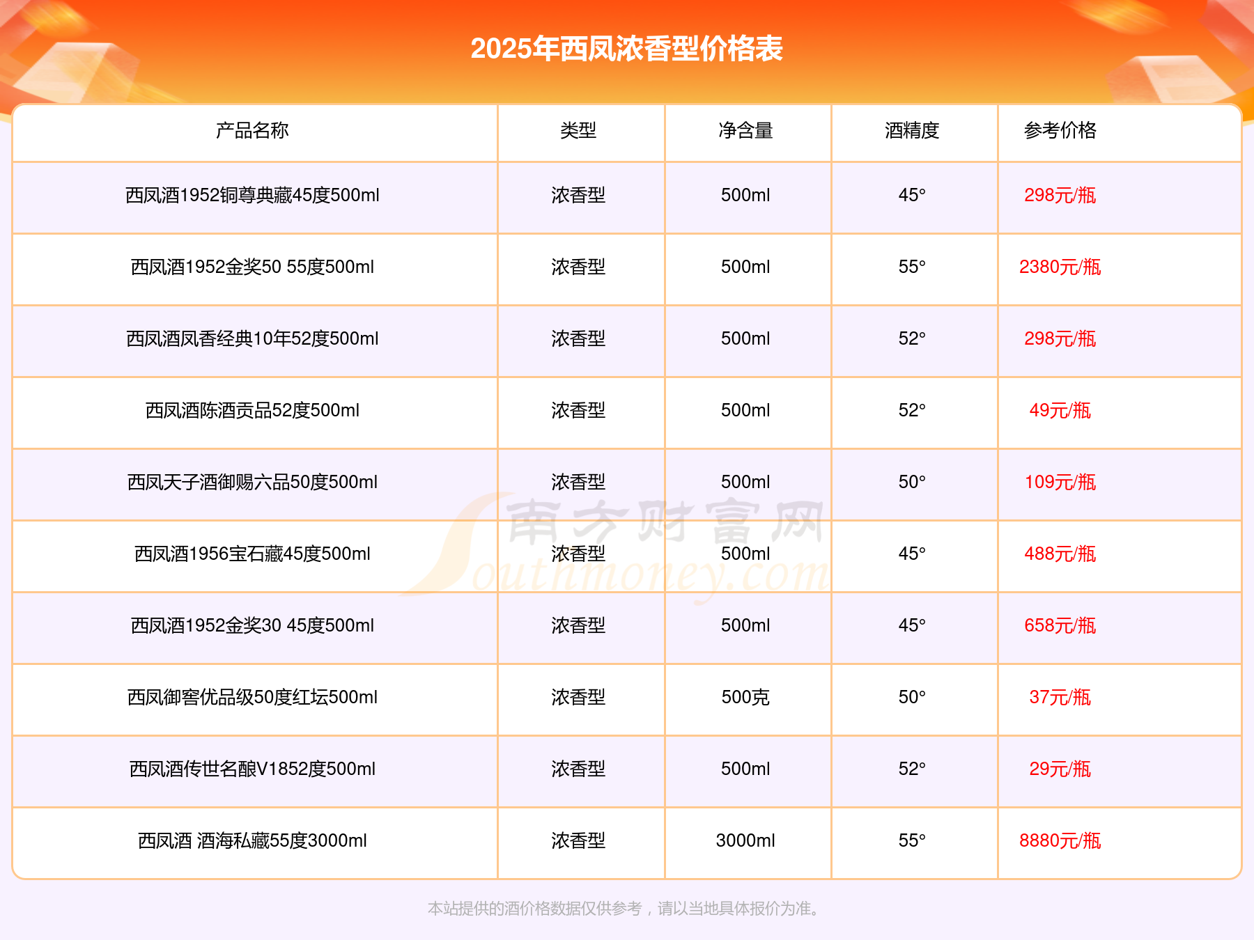 2025年西鳳濃香型酒西鳳酒 酒海私藏55度3000ml、西鳳酒1952金獎(jiǎng)50 55度500ml、西鳳酒2013年產(chǎn)老酒鳳香經(jīng)典30年52度500ml、西鳳酒1952金獎(jiǎng)30 55度500ml、西鳳酒鳳香經(jīng)典20年52度500ml、西鳳酒1952金獎(jiǎng)30 45度500ml、西鳳酒1956紀(jì)念版52度500ml等最新價(jià)格如下: