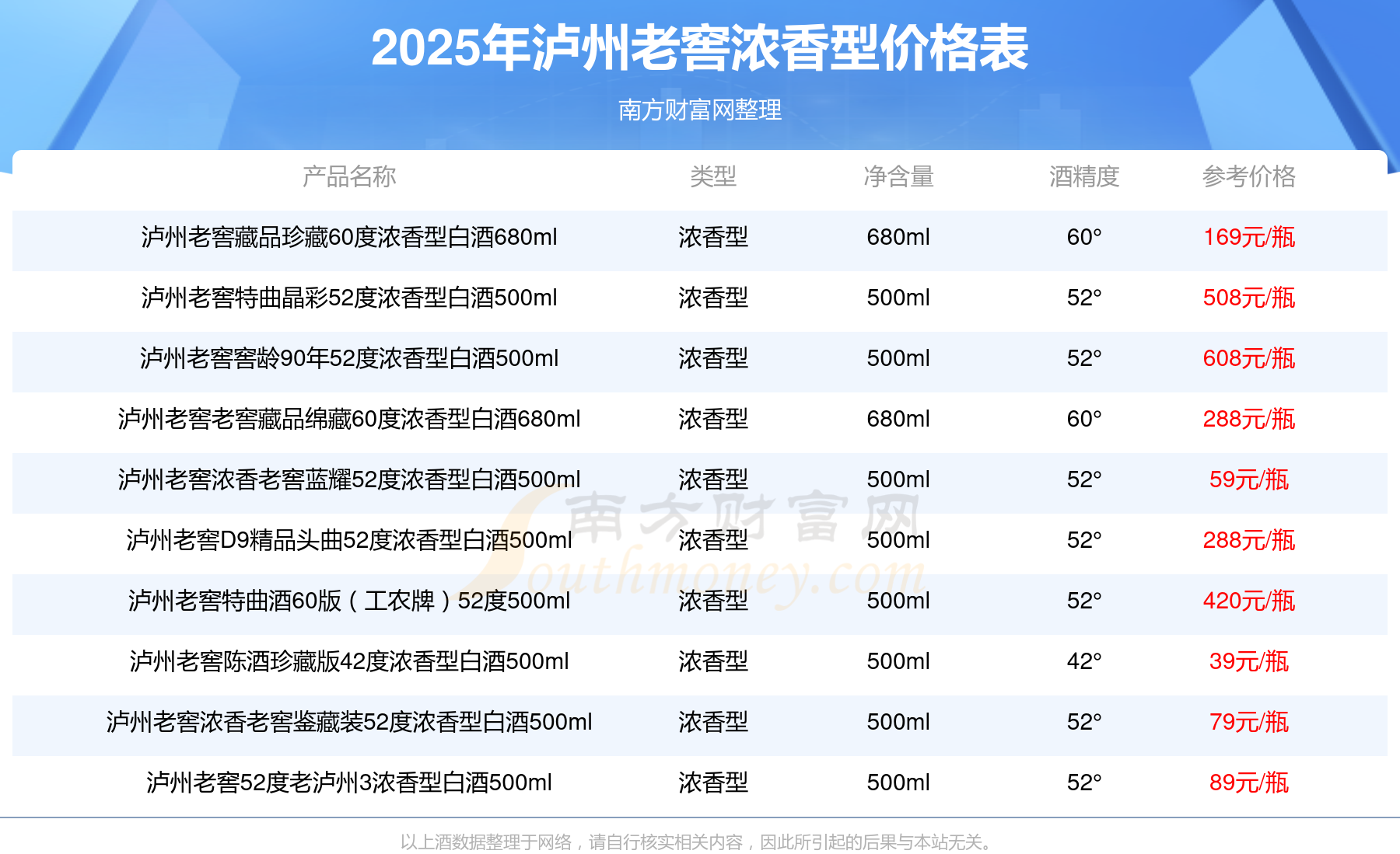 2025年,瀘州老窖濃香型酒價格最高的是瀘州老窖國窖1573春釀鼠兆豐年E 55度,參考價17999元,最低的是瀘州老窖45度五洲醉8窖經(jīng)典小酒版濃香型100ml,參考價10元,價格高低差為17989元。