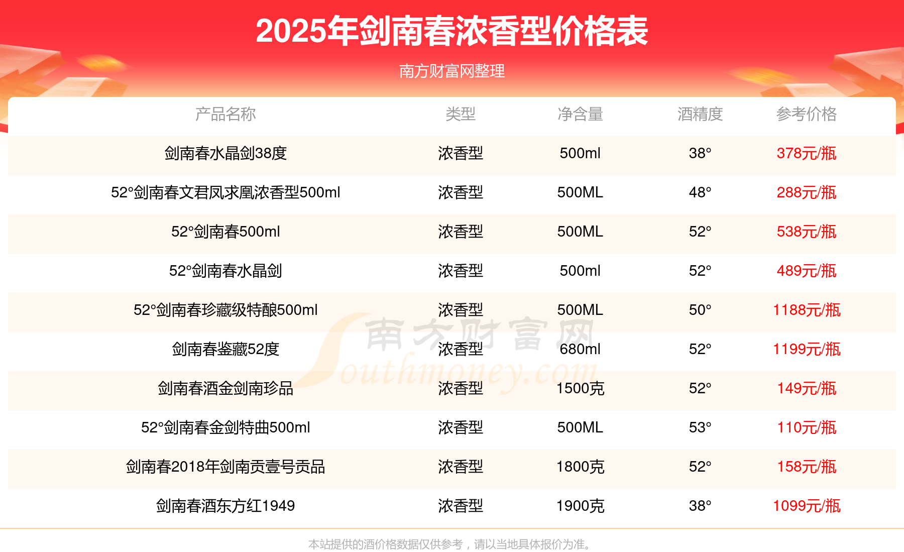 劍南春濃香型酒最新價(jià)格2025: