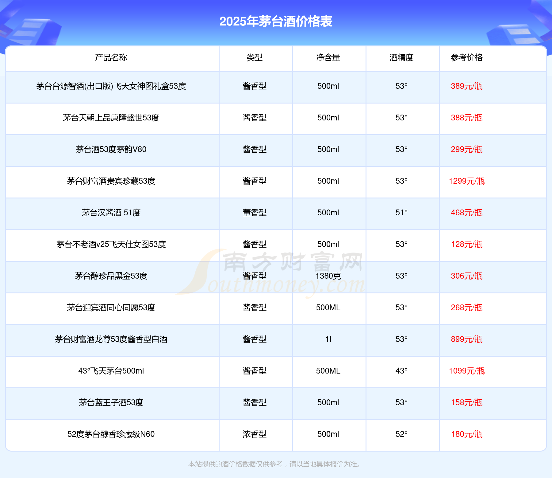 2025年,華茅鑒藏 醬香型白酒 3L 53°、53度五星茅臺生肖酒丁酉雞年、貴州茅臺己亥豬年生肖酒53°500ml、53度五星茅臺生肖酒戊戌狗年、飛天茅臺53°500ml(2015年)、茅臺王子酒己亥豬年生肖紀念酒53度2.5L、茅臺1935醬香型53度、茅臺財富貴賓典藏酒53度等茅臺酒價格如下:華茅鑒藏 醬香型白酒 3L 53°參考價8388元/瓶、53度五星茅臺生肖酒丁酉雞年參考價2798元/瓶、貴州茅臺己亥豬年生肖酒53°500ml參考價2699元/瓶、53度五星茅臺生肖酒戊戌狗年參考價2698元/瓶、飛天茅臺53°500ml(2015年)參考價2199元/瓶、茅臺王子酒己亥豬年生肖紀念酒53度2.5L參考價2099元/瓶、茅臺1935醬香型53度參考價1799元/瓶、茅臺財富貴賓典藏酒53度參考價1599元/瓶。