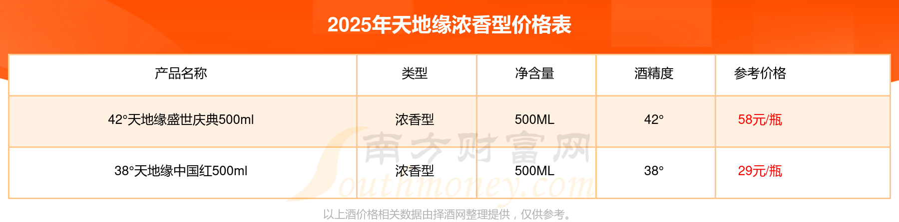 天地緣濃香型酒最新價格2025:42°天地緣盛世慶典500ml參考價58元/瓶、38°天地緣中國紅500ml參考價29元/瓶。