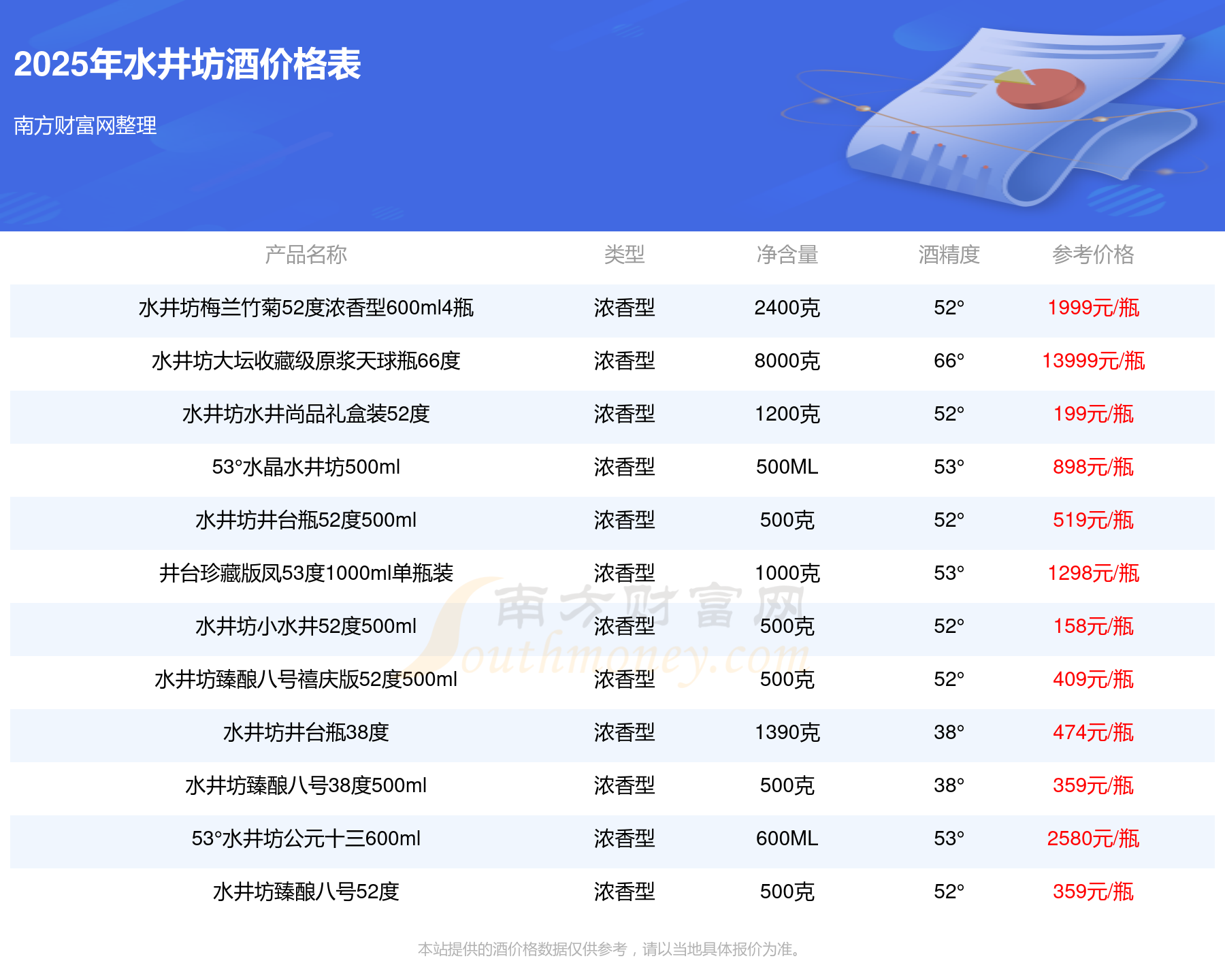 水井坊大壇收藏級原漿天球瓶66度參考價13999元/瓶、水井坊博物館壹號53度雙瓶裝參考價10988元/瓶、53°水井坊公元十三600ml參考價2580元/瓶、水井坊梅蘭竹菊52度濃香型600ml4瓶參考價1999元/瓶、水井坊菁翠52度500ml參考價1650元/瓶、井臺珍藏版龍53度1000ml單瓶裝參考價1298元/瓶。