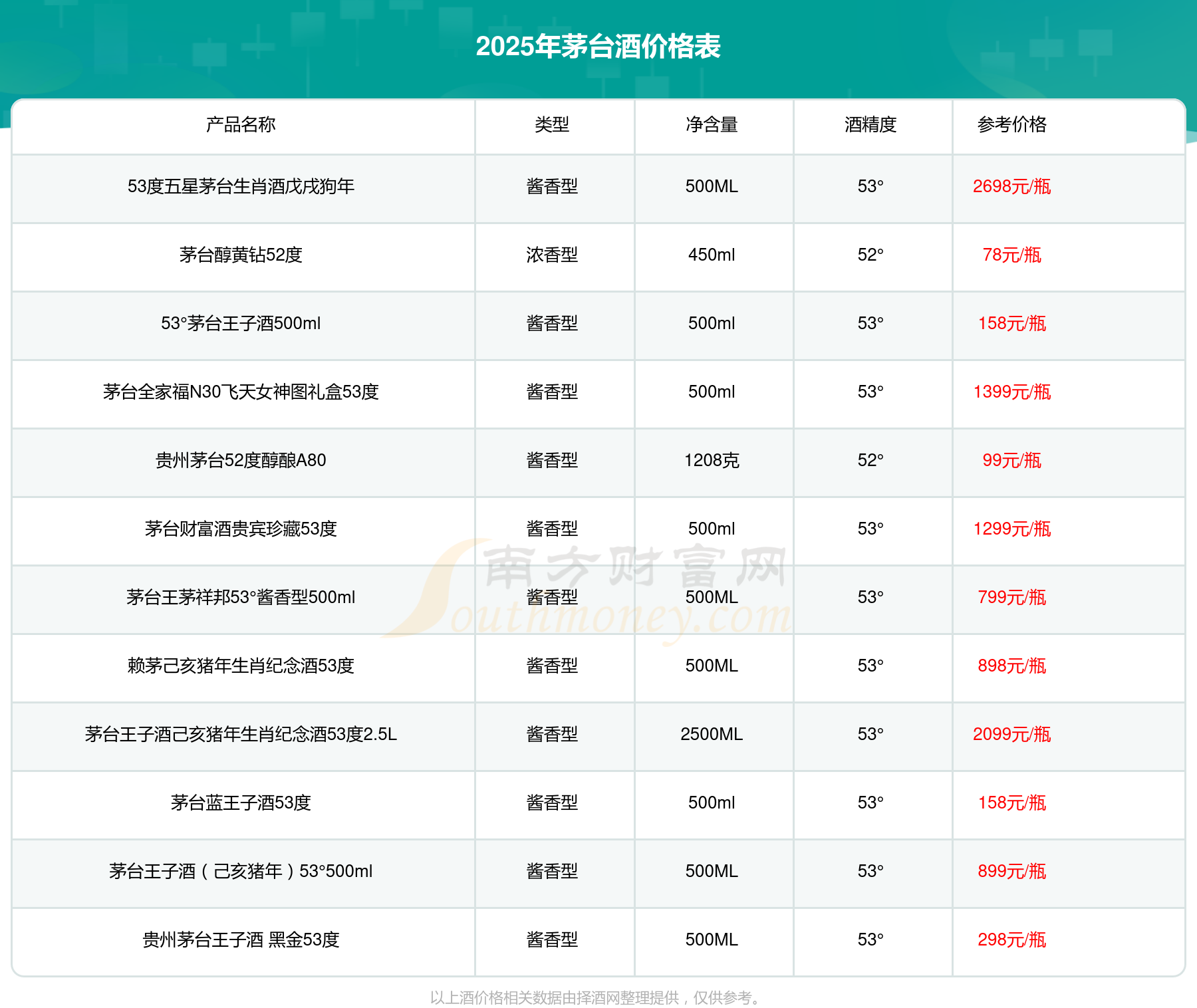2025年,華茅鑒藏 醬香型白酒 3L 53°、53度五星茅臺生肖酒丁酉雞年、貴州茅臺己亥豬年生肖酒53°500ml、53度五星茅臺生肖酒戊戌狗年等茅臺酒價格如下:華茅鑒藏 醬香型白酒 3L 53°參考價8388元/瓶、53度五星茅臺生肖酒丁酉雞年參考價2798元/瓶、貴州茅臺己亥豬年生肖酒53°500ml參考價2699元/瓶、53度五星茅臺生肖酒戊戌狗年參考價2698元/瓶。