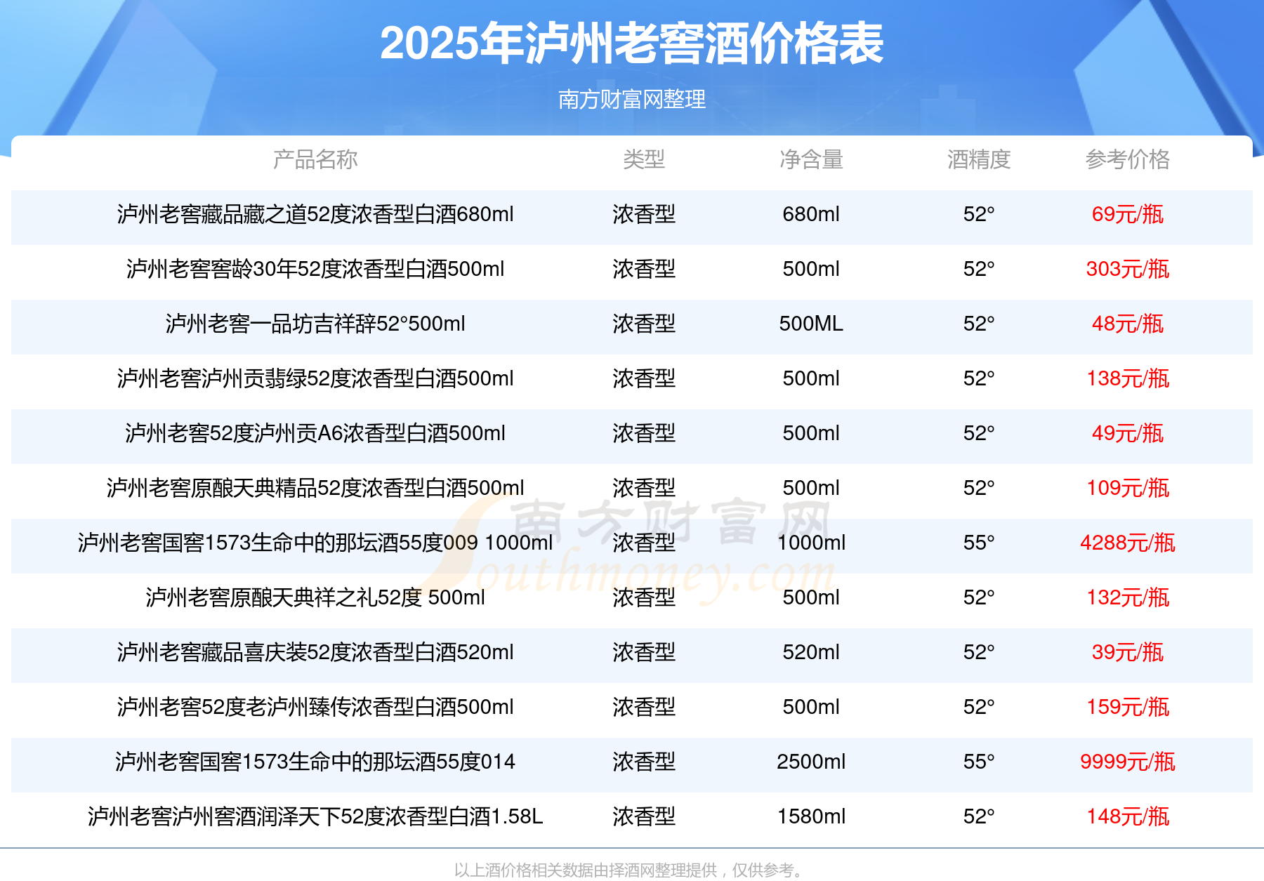 2025年,瀘州老窖國窖1573春釀鼠兆豐年E 55度、瀘州老窖國窖1573生命中的那壇酒55度014、瀘州老窖國窖1573春釀鼠兆豐年A 55度、瀘州老窖國窖1573生命中的那壇酒55度013濃香型白酒1000ml、瀘州老窖國窖1573生命中的那壇酒55度009 1000ml、瀘州老窖國窖1573中國品味52度濃香型白酒500ml、瀘州老窖國窖1573許燎源概念作品58度濃香型白酒1000ml等瀘州老窖酒參考價(jià)格如下:瀘州老窖國窖1573春釀鼠兆豐年E 55度參考價(jià)17999元、瀘州老窖國窖1573生命中的那壇酒55度014參考價(jià)9999元、瀘州老窖國窖1573春釀鼠兆豐年A 55度參考價(jià)5088元、瀘州老窖國窖1573生命中的那壇酒55度013濃香型白酒1000ml參考價(jià)4988元、瀘州老窖國窖1573生命中的那壇酒55度009 1000ml參考價(jià)4288元、瀘州老窖國窖1573中國品味52度濃香型白酒500ml參考價(jià)2888元、瀘州老窖國窖1573許燎源概念作品58度濃香型白酒1000ml參考價(jià)2680元。
