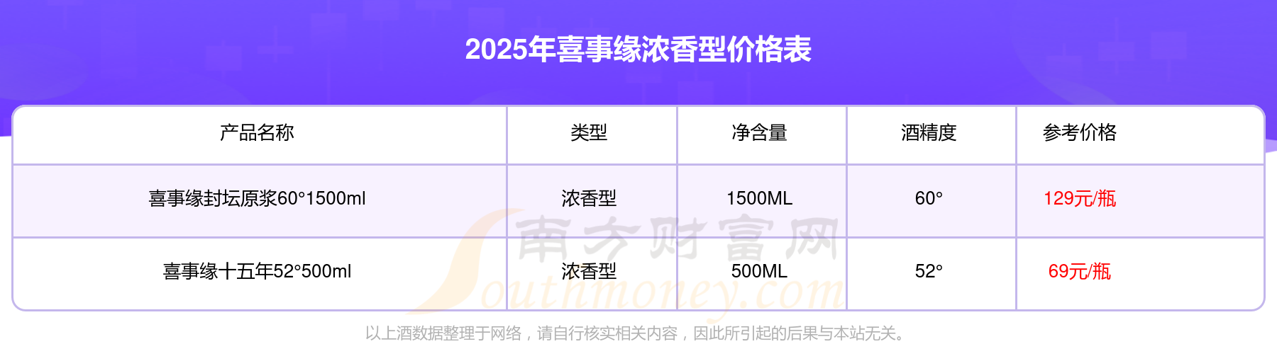 2025喜事緣濃香型酒最新價(jià)格:喜事緣封壇原漿60°1500ml參考價(jià)129元/瓶、喜事緣十五年52°500ml參考價(jià)69元/瓶。