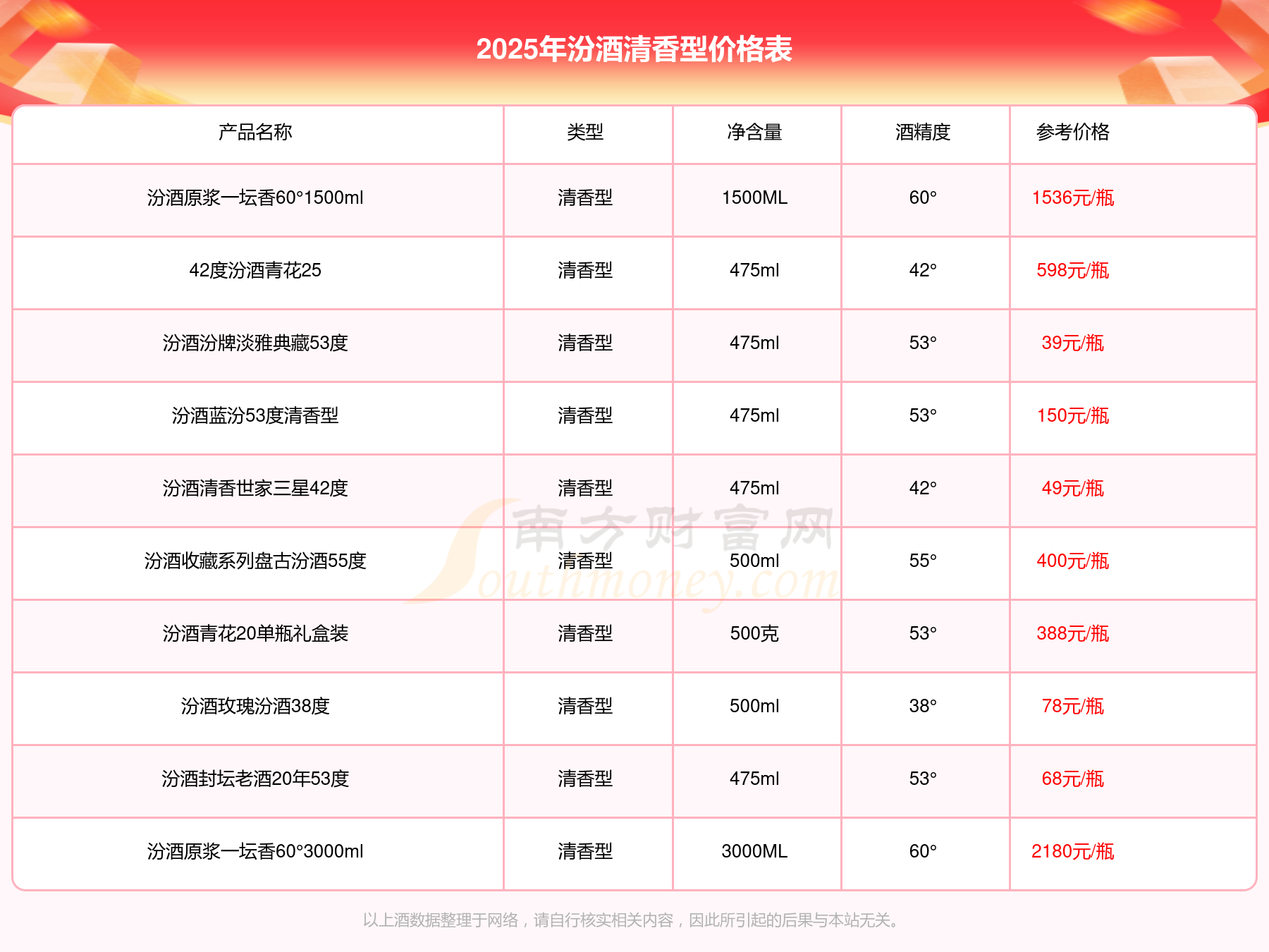 2025年汾酒清香型價(jià)格最高的酒是汾酒原漿一壇香60°3000ml,參考價(jià)2180元/瓶,最低的是汾酒百年汾杏酒純釀53度,參考價(jià)28元/瓶,價(jià)格高低差為2152元/瓶。
