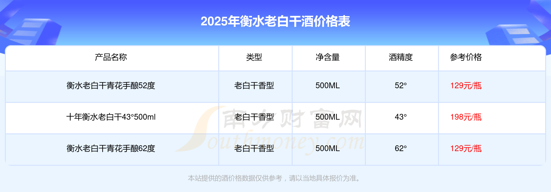 十年衡水老白干43°500ml參考價198元/瓶、衡水老白干青花手釀52度參考價129元/瓶、衡水老白干青花手釀62度參考價129元/瓶。