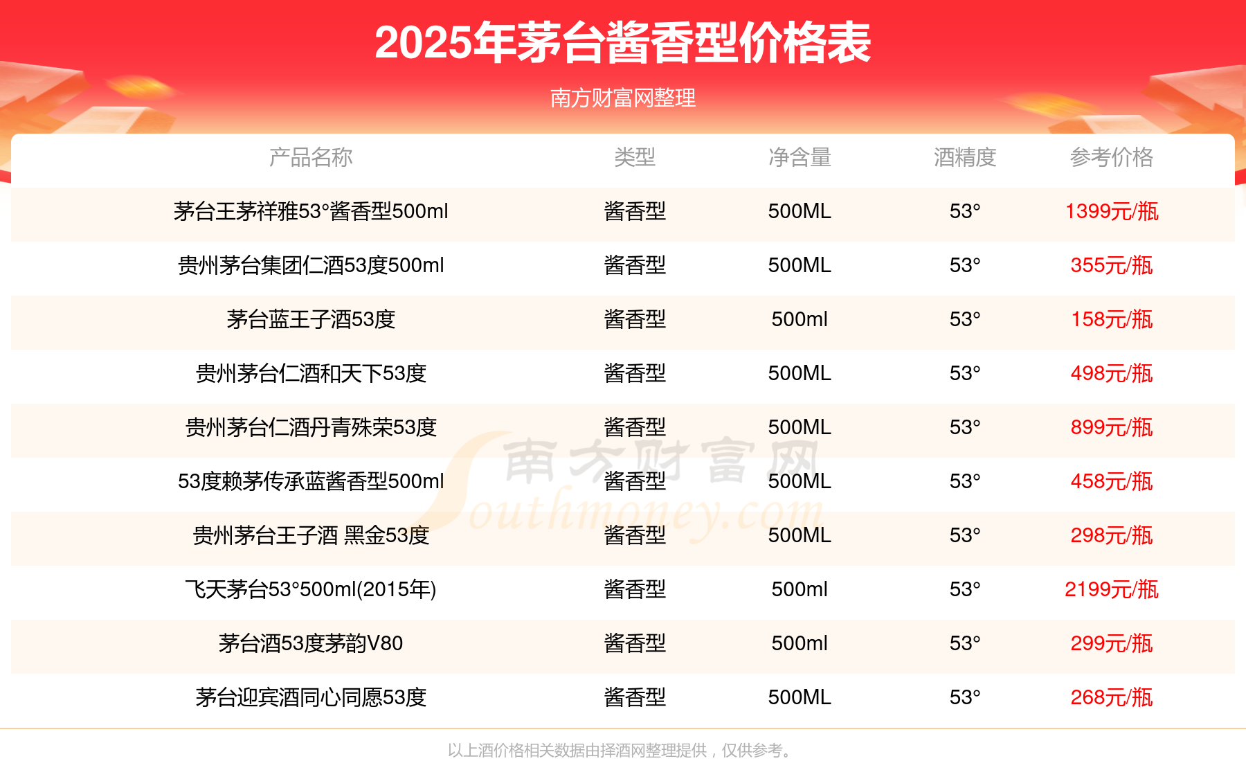 2025年,華茅鑒藏 醬香型白酒 3L 53°、53度五星茅臺(tái)生肖酒丁酉雞年、貴州茅臺(tái)己亥豬年生肖酒53°500ml、53度五星茅臺(tái)生肖酒戊戌狗年、飛天茅臺(tái)53°500ml(2015年)、茅臺(tái)王子酒己亥豬年生肖紀(jì)念酒53度2.5L等茅臺(tái)醬香型酒價(jià)格如下:華茅鑒藏 醬香型白酒 3L 53°參考價(jià)8388元/瓶、53度五星茅臺(tái)生肖酒丁酉雞年參考價(jià)2798元/瓶、貴州茅臺(tái)己亥豬年生肖酒53°500ml參考價(jià)2699元/瓶、53度五星茅臺(tái)生肖酒戊戌狗年參考價(jià)2698元/瓶、飛天茅臺(tái)53°500ml(2015年)參考價(jià)2199元/瓶、茅臺(tái)王子酒己亥豬年生肖紀(jì)念酒53度2.5L參考價(jià)2099元/瓶。