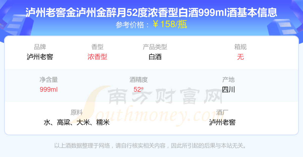 瀘州老窖金瀘州金醉月52度濃香型白酒999ml基本信息