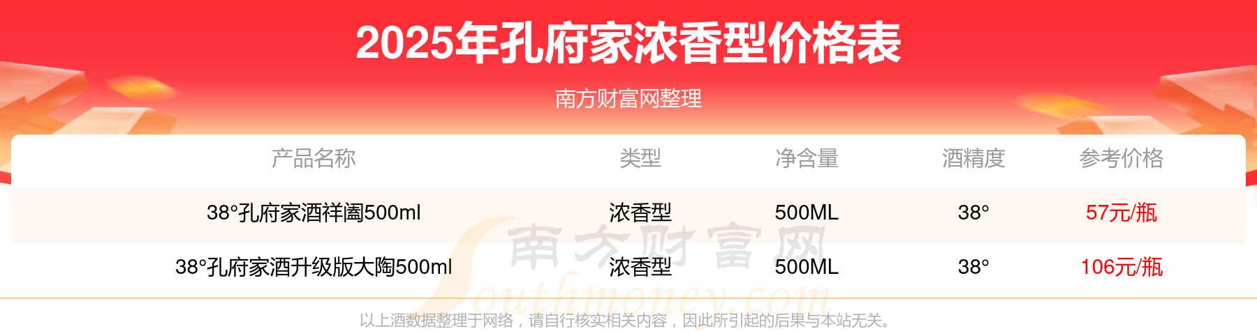 2025年,38°孔府家酒升級(jí)版大陶500ml、38°孔府家酒祥闔500ml等孔府家濃香型酒價(jià)格如下:38°孔府家酒升級(jí)版大陶500ml參考價(jià)106元/瓶、38°孔府家酒祥闔500ml參考價(jià)57元/瓶。