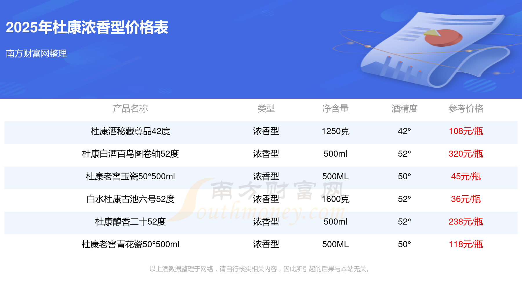 杜康白酒百鳥圖卷軸52度參考價(jià)320元/瓶、杜康醇香二十52度參考價(jià)238元/瓶、杜康老窖青花瓷50°500ml參考價(jià)118元/瓶、杜康酒秘藏尊品42度參考價(jià)108元/瓶。