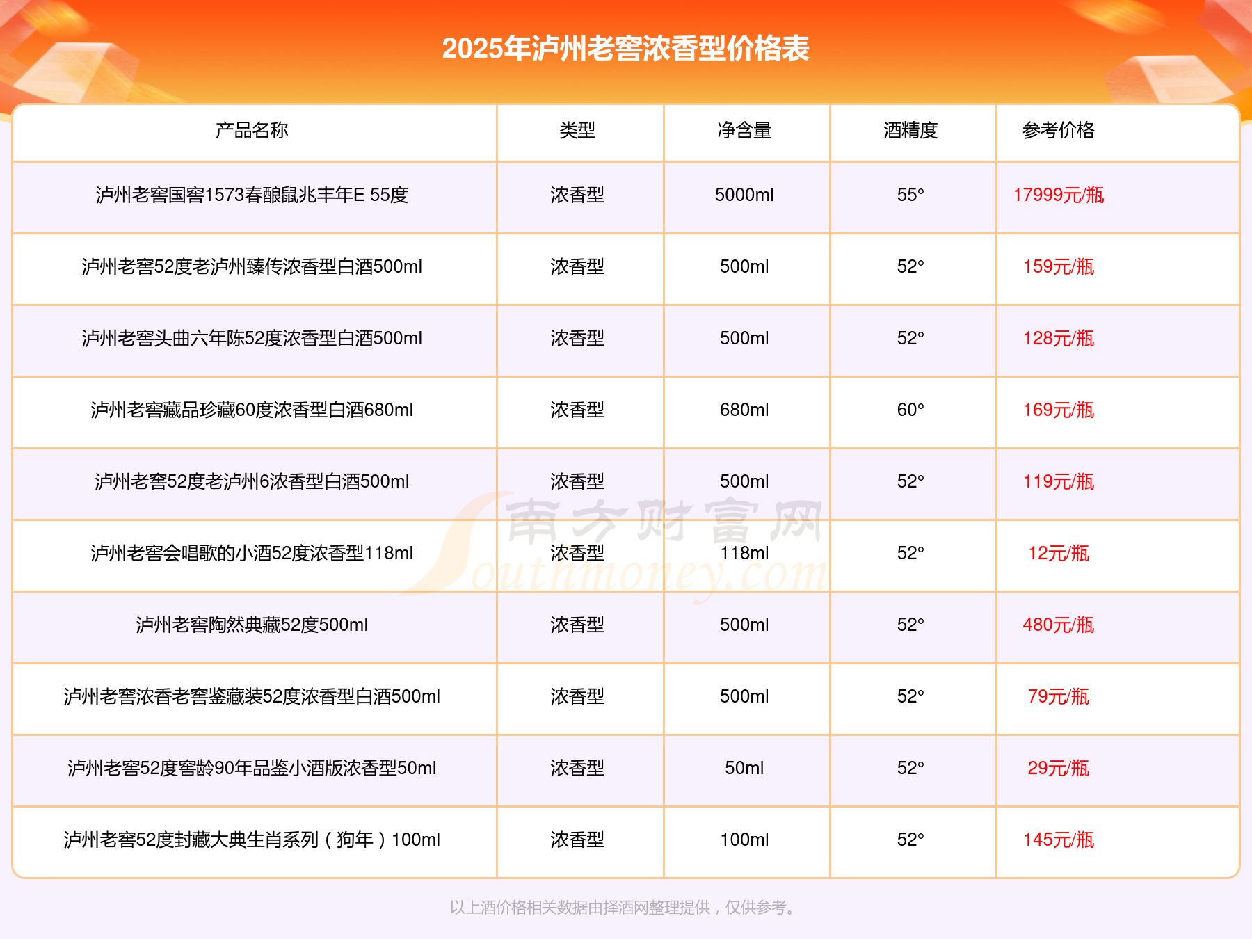 2025年,瀘州老窖濃香型酒價格最高的是瀘州老窖國窖1573春釀鼠兆豐年E 55度,參考價17999元,最低的是瀘州老窖45度五洲醉8窖經(jīng)典小酒版濃香型100ml,參考價10元,價格高低差為17989元。