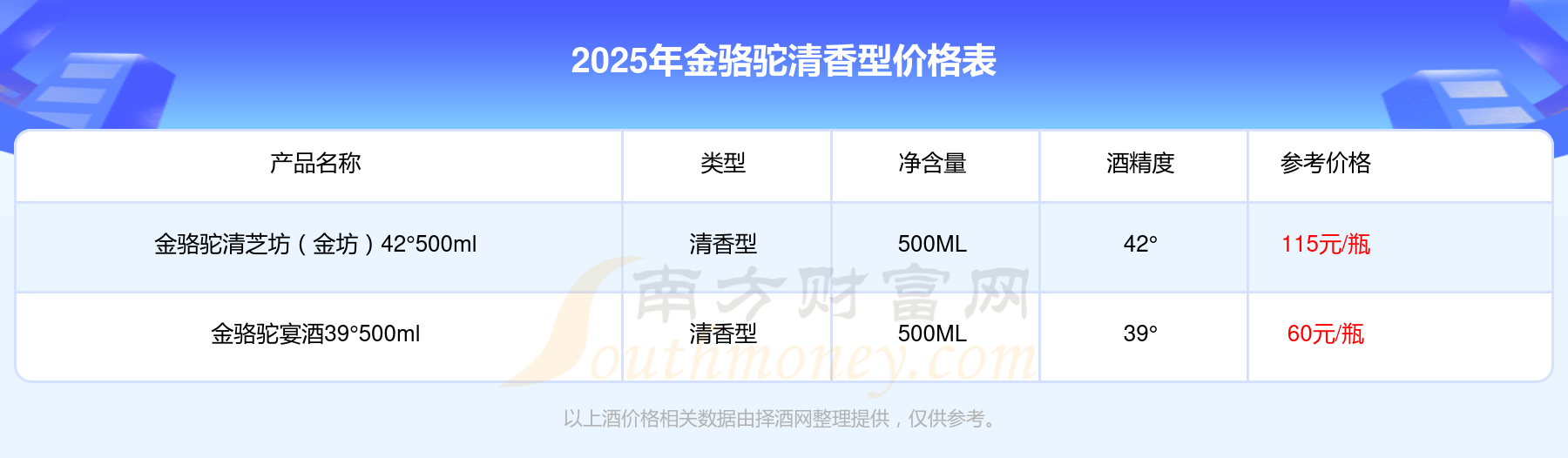 金駱駝清香型酒最新價(jià)格2025:金駱駝清芝坊(金坊)42°500ml參考價(jià)115元/瓶、金駱駝宴酒39°500ml參考價(jià)60元/瓶。