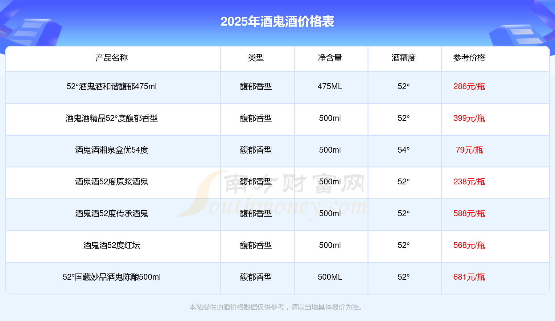 2025酒鬼酒最新價(jià)格:52°國藏妙品酒鬼陳釀500ml參考價(jià)681元/瓶、酒鬼酒52度傳承酒鬼參考價(jià)588元/瓶、酒鬼酒52度紅壇參考價(jià)568元/瓶、酒鬼酒精品52°度馥郁香型參考價(jià)399元/瓶、52°酒鬼酒和諧馥郁475ml參考價(jià)286元/瓶。
