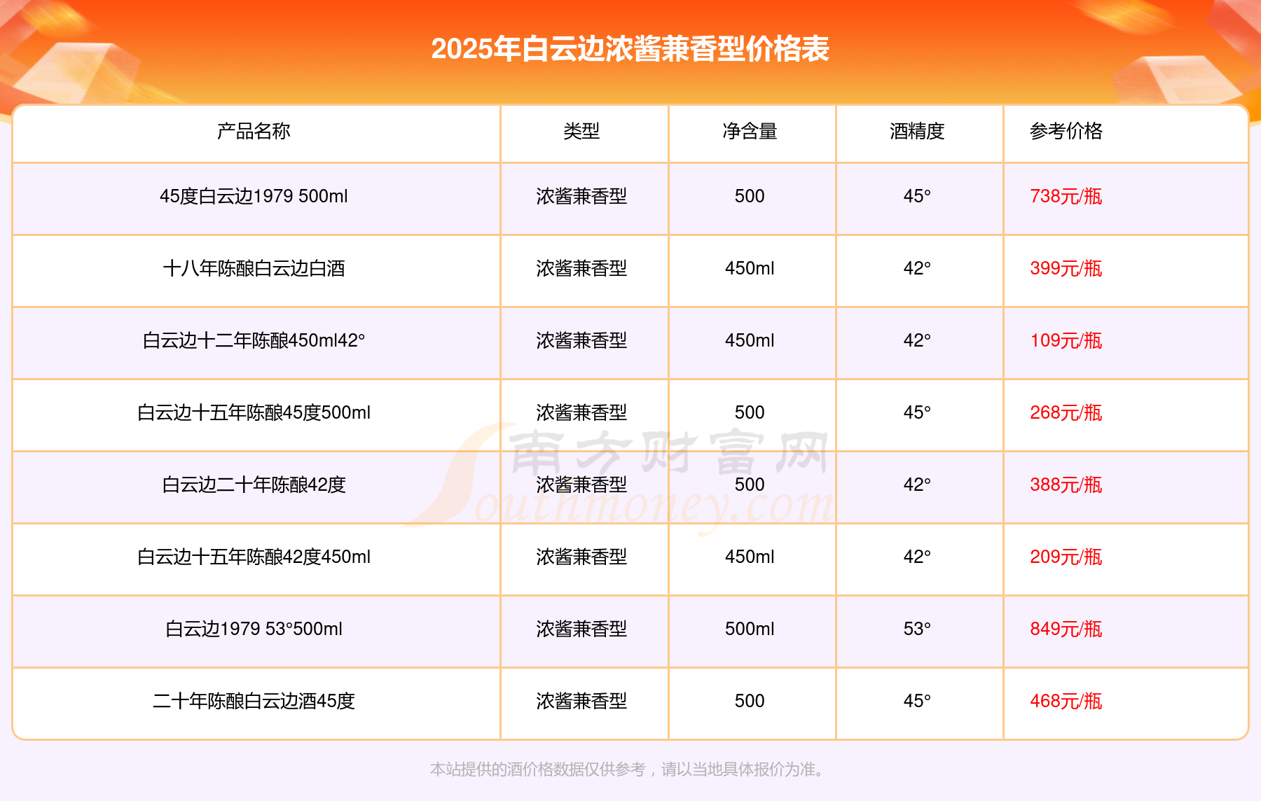 2025年,白云邊1979 53°500ml、45度白云邊1979 500ml、二十年陳釀白云邊酒45度、十八年陳釀白云邊白酒、白云邊二十年陳釀42度、白云邊十五年陳釀45度500ml、白云邊十五年陳釀42度450ml等白云邊濃醬兼香型酒參考價(jià)格如下:白云邊1979 53°500ml參考價(jià)849元、45度白云邊1979 500ml參考價(jià)738元、二十年陳釀白云邊酒45度參考價(jià)468元、十八年陳釀白云邊白酒參考價(jià)399元、白云邊二十年陳釀42度參考價(jià)388元、白云邊十五年陳釀45度500ml參考價(jià)268元、白云邊十五年陳釀42度450ml參考價(jià)209元。