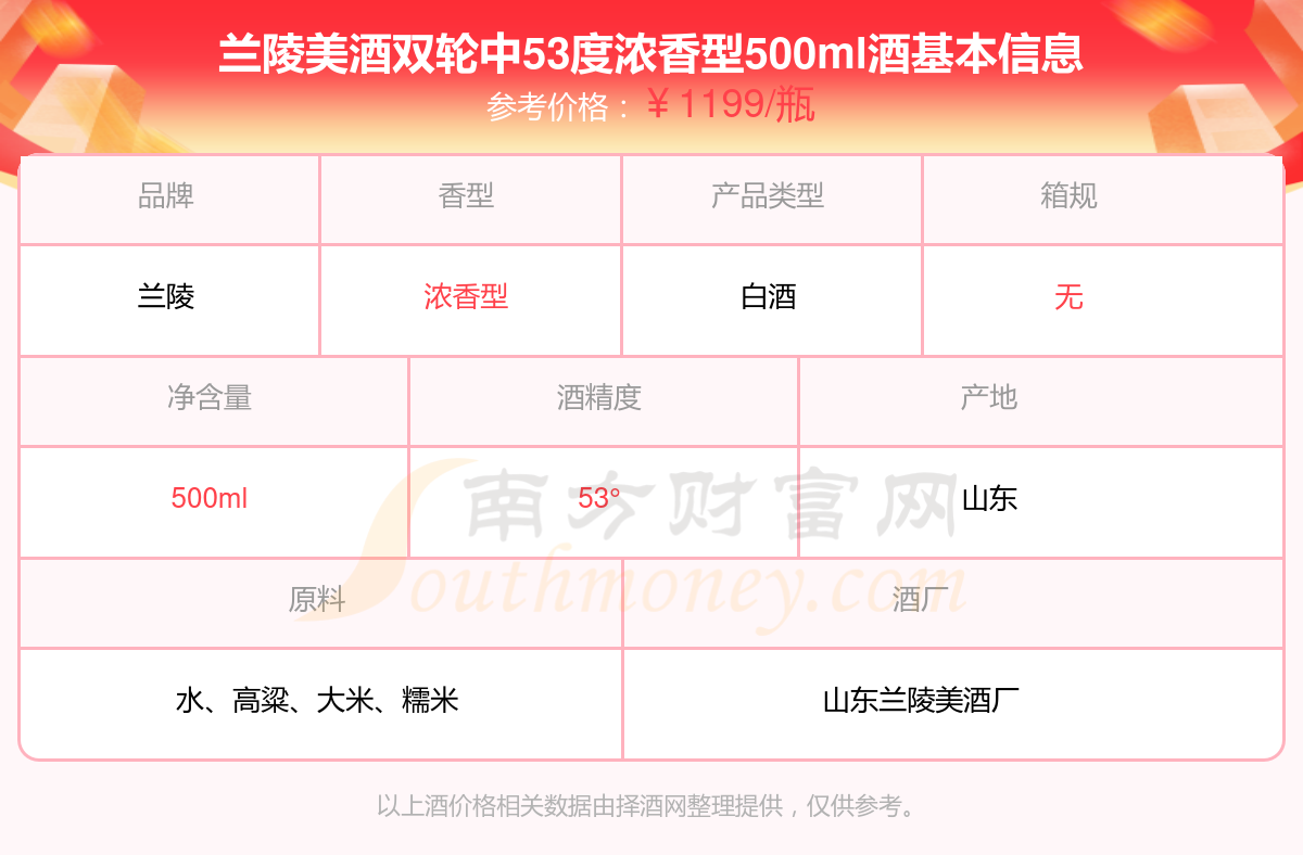 蘭陵美酒雙輪中53度濃香型500ml基本信息