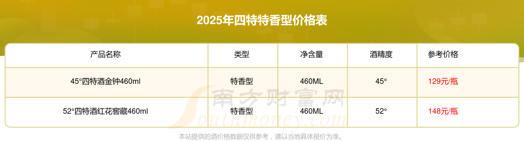 2025年,52°四特酒紅花窖藏460ml、45°四特酒金鐘460ml等四特特香型酒參考價(jià)格如下:52°四特酒紅花窖藏460ml參考價(jià)148元、45°四特酒金鐘460ml參考價(jià)129元。
