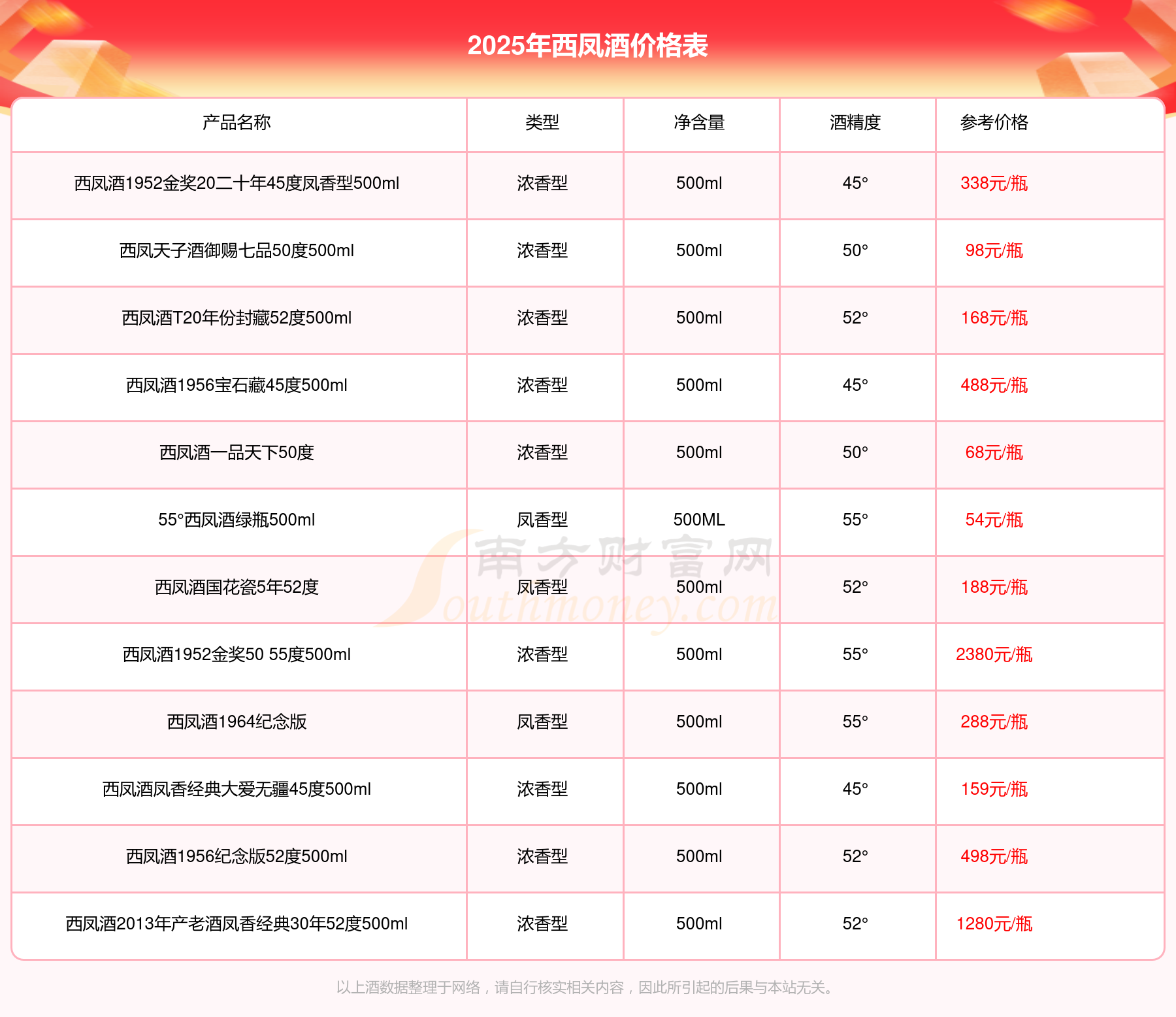 2025年西鳳酒西鳳酒 酒海私藏55度3000ml、西鳳酒1952金獎50 55度500ml、西鳳酒2013年產(chǎn)老酒鳳香經(jīng)典30年52度500ml、西鳳酒1956鉆石藏45度500ml、西鳳酒1952金獎30 55度500ml等最新價格如下:西鳳酒 酒海私藏55度3000ml參考價8880元/瓶、西鳳酒1952金獎50 55度500ml參考價2380元/瓶、西鳳酒2013年產(chǎn)老酒鳳香經(jīng)典30年52度500ml參考價1280元/瓶、西鳳酒1956鉆石藏45度500ml參考價980元/瓶、西鳳酒1952金獎30 55度500ml參考價898元/瓶。