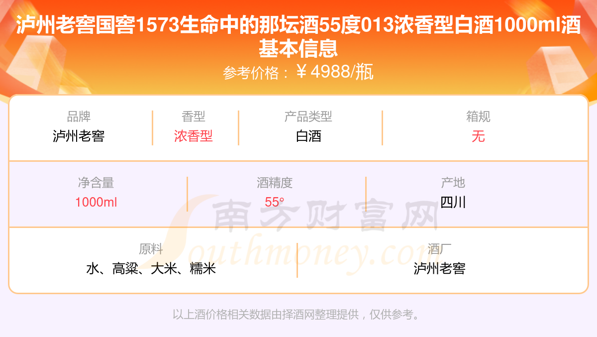 瀘州老窖國(guó)窖1573生命中的那壇酒55度013濃香型白酒1000ml基本信息