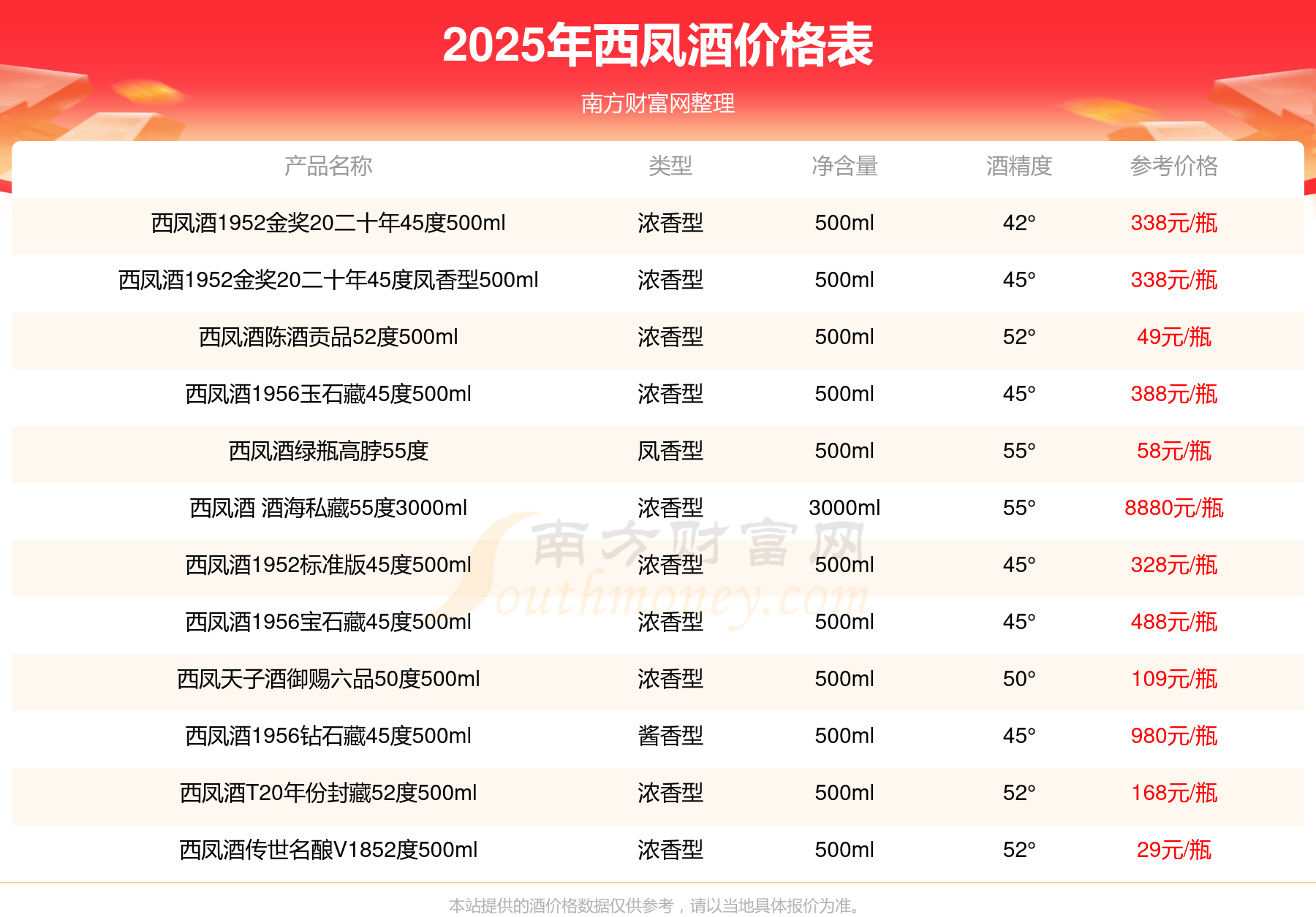 2025年西鳳酒西鳳酒 酒海私藏55度3000ml、西鳳酒1952金獎50 55度500ml、西鳳酒2013年產(chǎn)老酒鳳香經(jīng)典30年52度500ml等最新價格如下:西鳳酒 酒海私藏55度3000ml參考價8880元/瓶、西鳳酒1952金獎50 55度500ml參考價2380元/瓶、西鳳酒2013年產(chǎn)老酒鳳香經(jīng)典30年52度500ml參考價1280元/瓶。