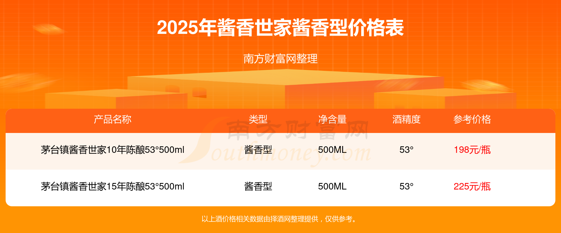 2025年醬香世家醬香型價格最高的酒是茅臺鎮(zhèn)醬香世家15年陳釀53°500ml,參考價225元/瓶,最低的是茅臺鎮(zhèn)醬香世家10年陳釀53°500ml,參考價198元/瓶,價格高低差為27元/瓶。
