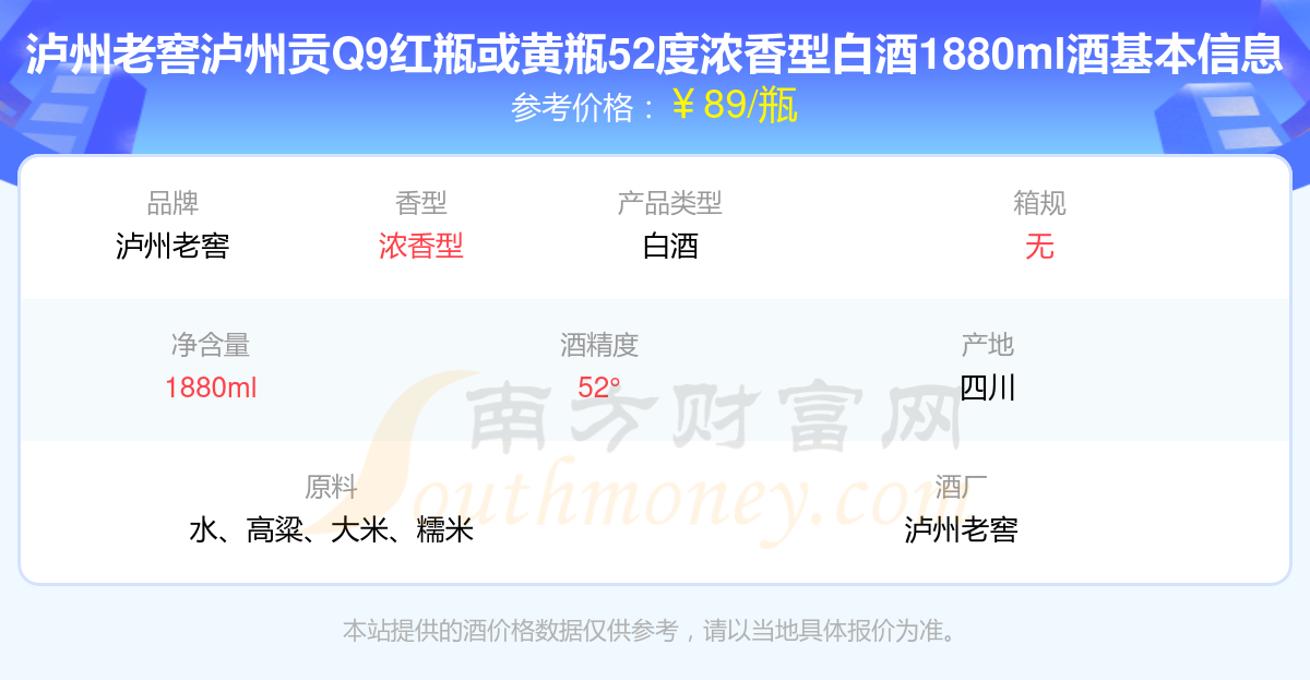 瀘州老窖瀘州貢Q9紅瓶或黃瓶52度濃香型白酒1880ml基本信息