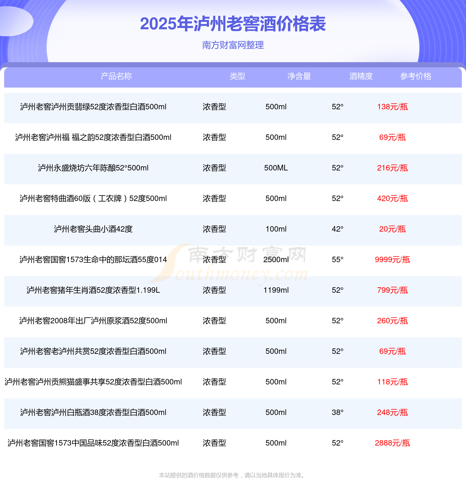 瀘州老窖國(guó)窖1573春釀鼠兆豐年E 55度參考價(jià)17999元/瓶、瀘州老窖國(guó)窖1573生命中的那壇酒55度014參考價(jià)9999元/瓶、瀘州老窖國(guó)窖1573春釀鼠兆豐年A 55度參考價(jià)5088元/瓶、瀘州老窖國(guó)窖1573生命中的那壇酒55度013濃香型白酒1000ml參考價(jià)4988元/瓶、瀘州老窖國(guó)窖1573生命中的那壇酒55度009 1000ml參考價(jià)4288元/瓶、瀘州老窖國(guó)窖1573中國(guó)品味52度濃香型白酒500ml參考價(jià)2888元/瓶。