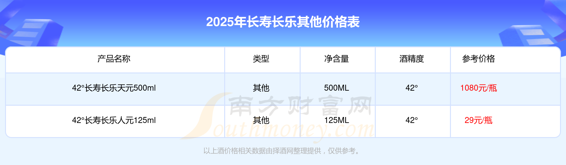 2025長(zhǎng)壽長(zhǎng)樂(lè)其他酒最新價(jià)格:42°長(zhǎng)壽長(zhǎng)樂(lè)天元500ml參考價(jià)1080元/瓶、42°長(zhǎng)壽長(zhǎng)樂(lè)人元125ml參考價(jià)29元/瓶。