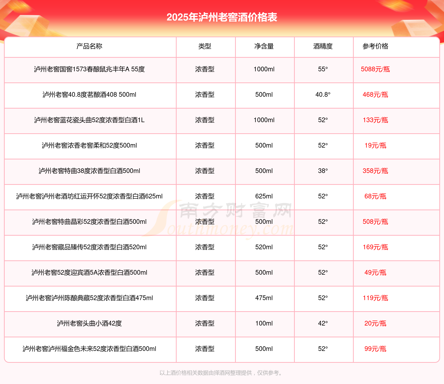 瀘州老窖國窖1573春釀鼠兆豐年E 55度參考價17999元/瓶、瀘州老窖國窖1573生命中的那壇酒55度014參考價9999元/瓶、瀘州老窖國窖1573春釀鼠兆豐年A 55度參考價5088元/瓶、瀘州老窖國窖1573生命中的那壇酒55度013濃香型白酒1000ml參考價4988元/瓶、瀘州老窖國窖1573生命中的那壇酒55度009 1000ml參考價4288元/瓶。