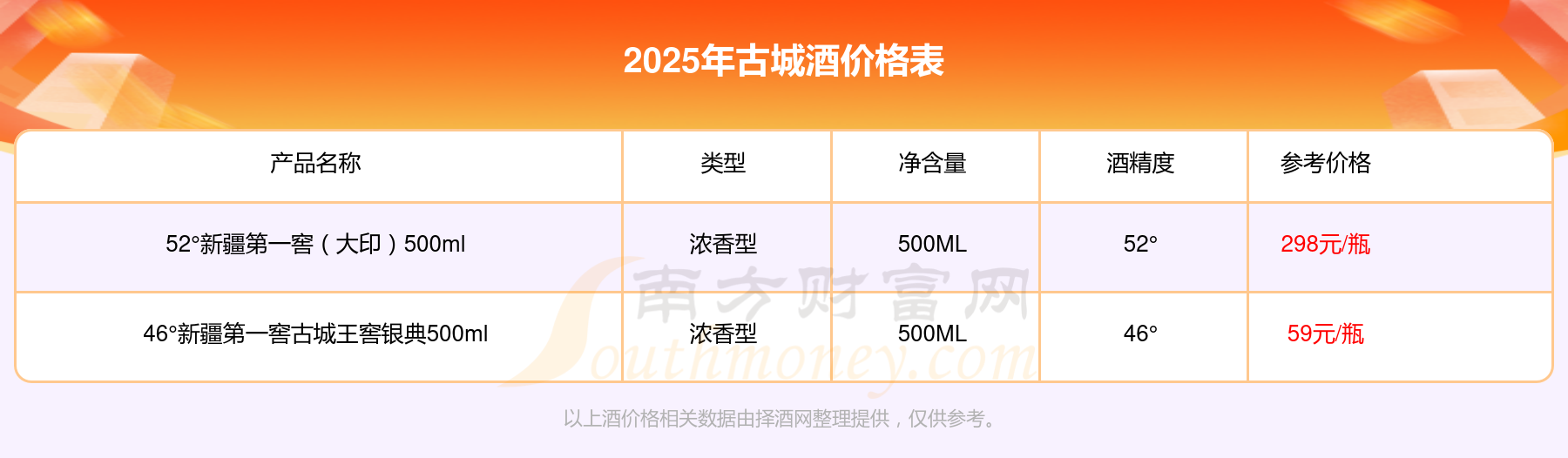 2025年,古城酒價格最高的是52°新疆第一窖(大印)500ml,參考價298元,最低的是46°新疆第一窖古城王窖銀典500ml,參考價59元,價格高低差為239元。