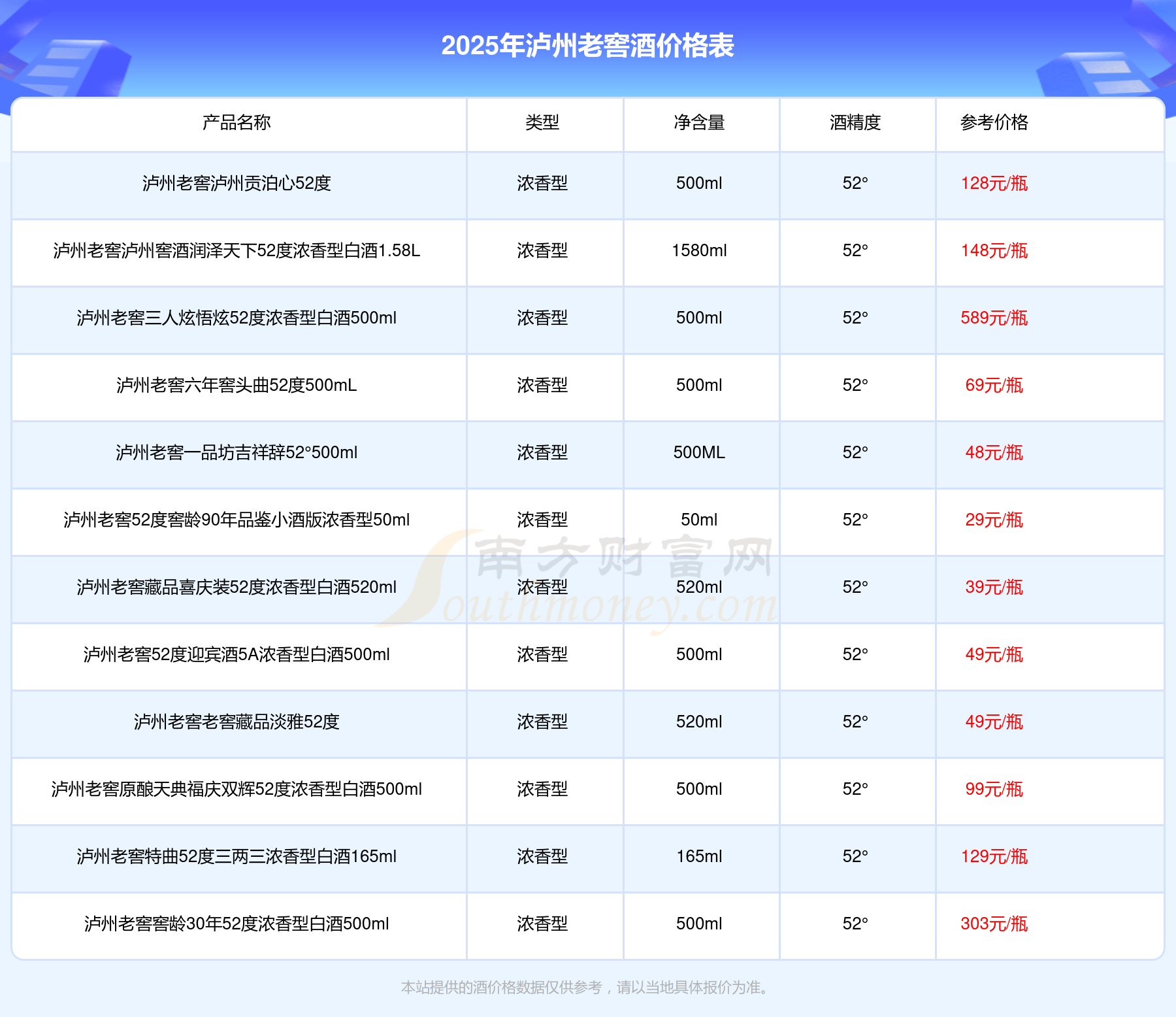 2025瀘州老窖酒最新價格:瀘州老窖國窖1573春釀鼠兆豐年E 55度參考價17999元/瓶、瀘州老窖國窖1573生命中的那壇酒55度014參考價9999元/瓶、瀘州老窖國窖1573春釀鼠兆豐年A 55度參考價5088元/瓶、瀘州老窖國窖1573生命中的那壇酒55度013濃香型白酒1000ml參考價4988元/瓶、瀘州老窖國窖1573生命中的那壇酒55度009 1000ml參考價4288元/瓶、瀘州老窖國窖1573中國品味52度濃香型白酒500ml參考價2888元/瓶。