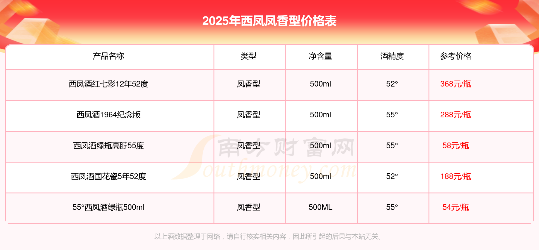 2025年,西鳳酒紅七彩12年52度、西鳳酒1964紀(jì)念版、西鳳酒國花瓷5年52度、西鳳酒綠瓶高脖55度、55°西鳳酒綠瓶500ml等西鳳鳳香型酒價(jià)格如下:西鳳酒紅七彩12年52度參考價(jià)368元/瓶、西鳳酒1964紀(jì)念版參考價(jià)288元/瓶、西鳳酒國花瓷5年52度參考價(jià)188元/瓶、西鳳酒綠瓶高脖55度參考價(jià)58元/瓶、55°西鳳酒綠瓶500ml參考價(jià)54元/瓶。