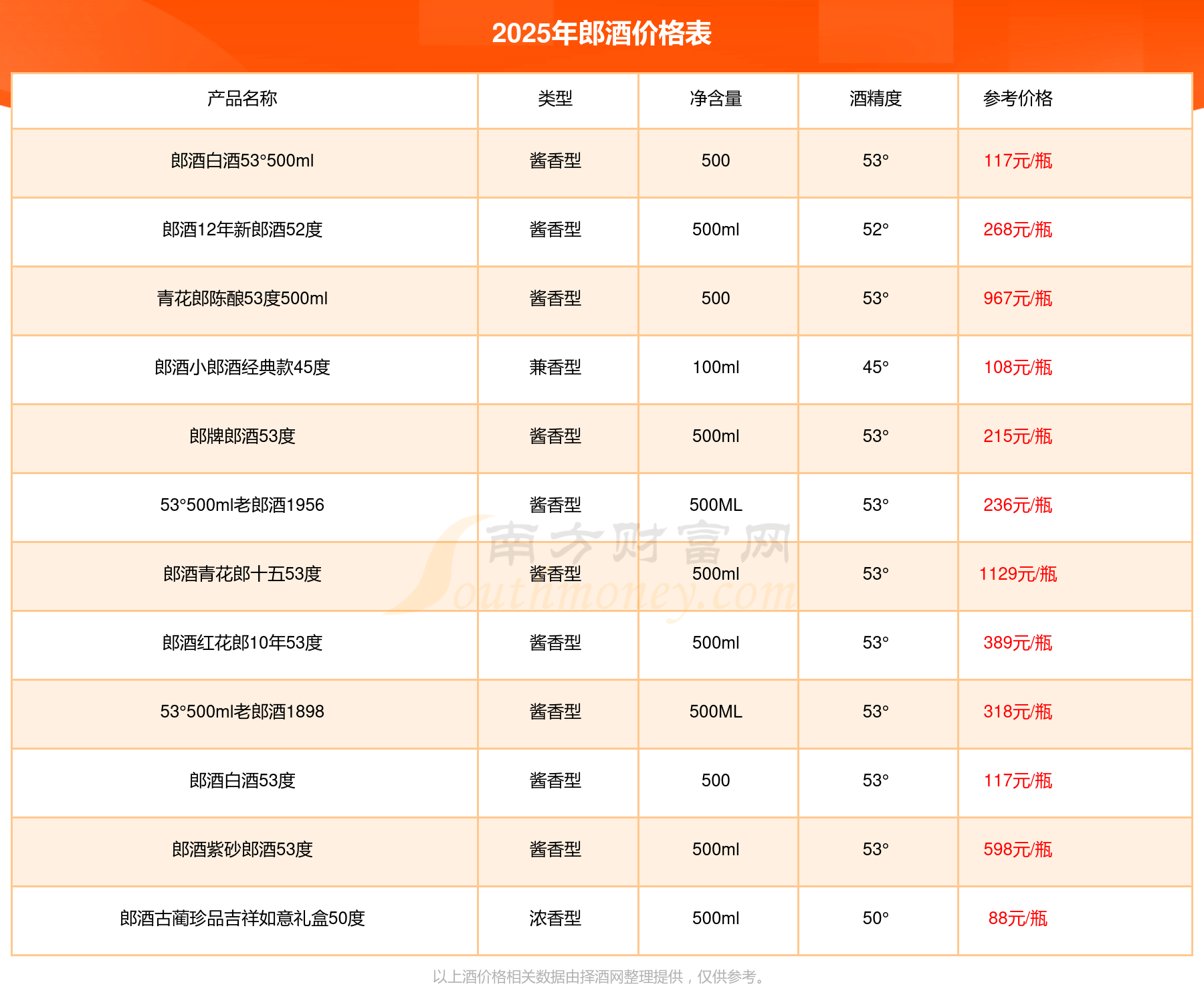 2025年,郎酒青花郎十五53度、青花郎陳釀53度500ml、郎酒紫砂郎酒53度、郎酒紅花郎10年53度、53°500ml老郎酒1898、郎酒12年新郎酒52度、53°500ml老郎酒1956等郎酒參考價(jià)格如下:郎酒青花郎十五53度參考價(jià)1129元、青花郎陳釀53度500ml參考價(jià)967元、郎酒紫砂郎酒53度參考價(jià)598元、郎酒紅花郎10年53度參考價(jià)389元、53°500ml老郎酒1898參考價(jià)318元、郎酒12年新郎酒52度參考價(jià)268元、53°500ml老郎酒1956參考價(jià)236元。