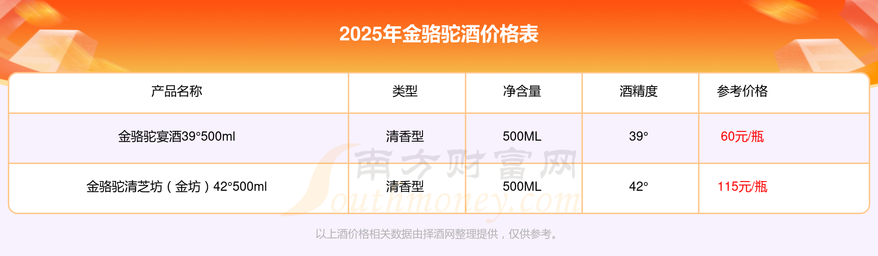 2025年,金駱駝清芝坊(金坊)42°500ml、金駱駝宴酒39°500ml等金駱駝酒價格如下: