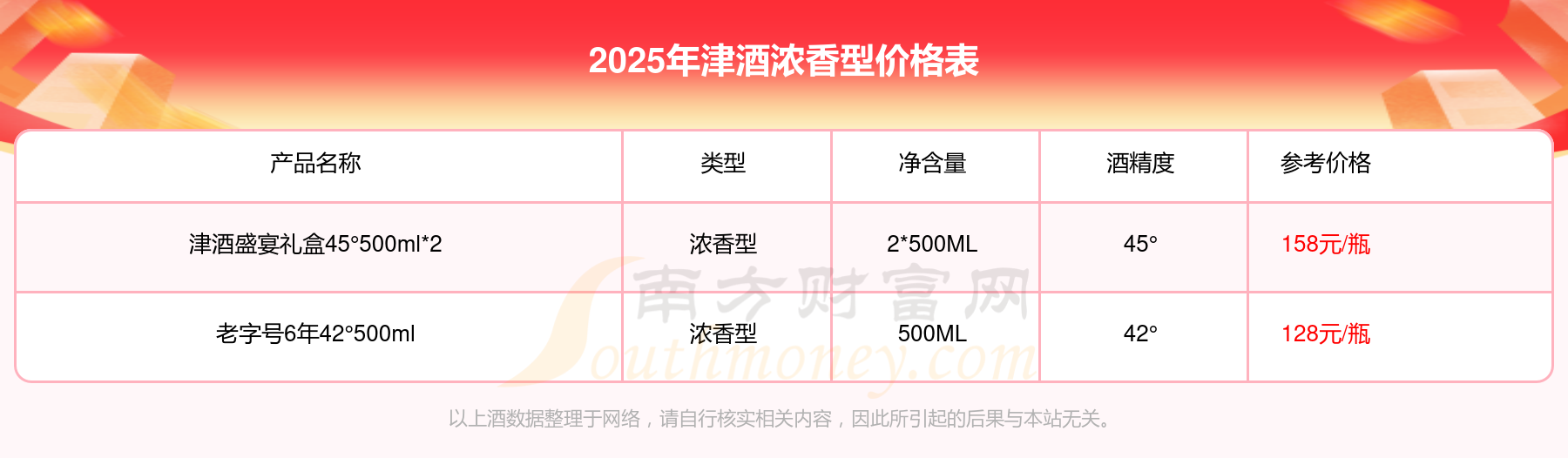 2025年津酒濃香型價格最高的酒是津酒盛宴禮盒45°500ml*2,參考價158元/瓶,最低的是老字號6年42°500ml,參考價128元/瓶,價格高低差為30元/瓶。