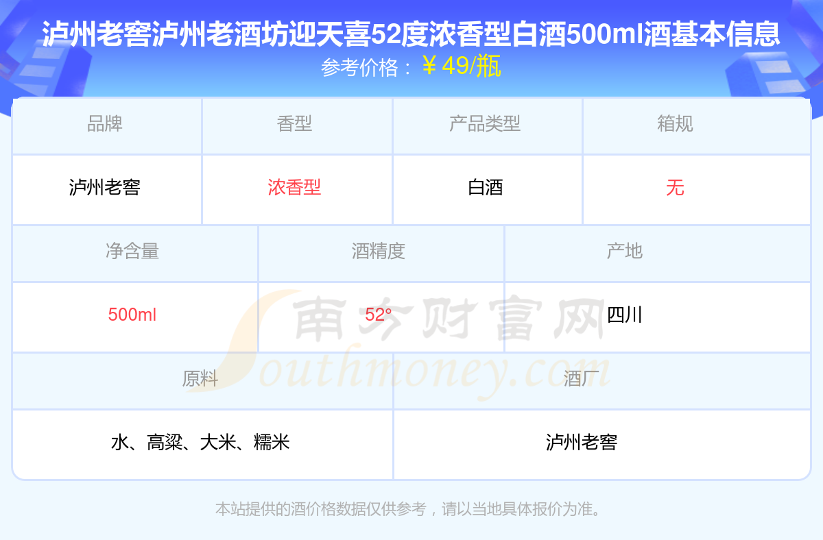 瀘州老窖瀘州老酒坊迎天喜52度濃香型白酒500ml基本信息