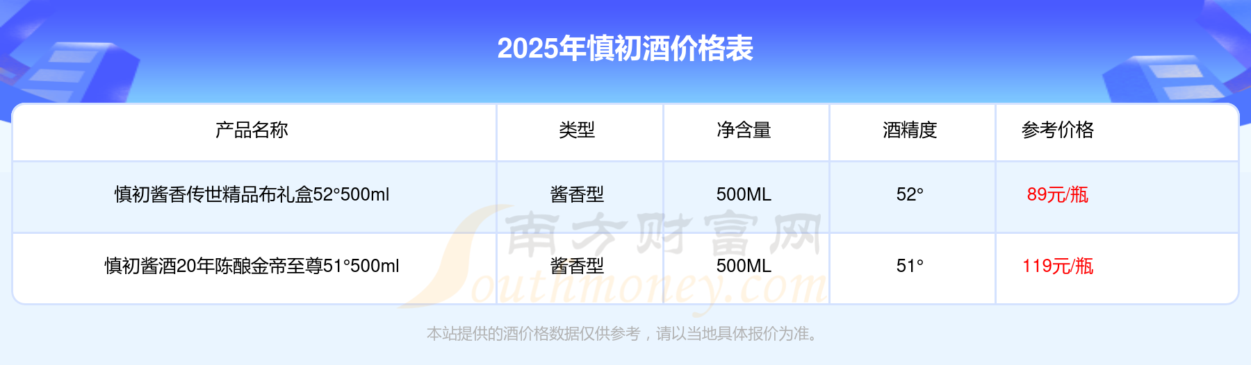 2025年,慎初醬酒20年陳釀金帝至尊51°500ml、慎初醬香傳世精品布禮盒52°500ml等慎初酒價(jià)格如下: