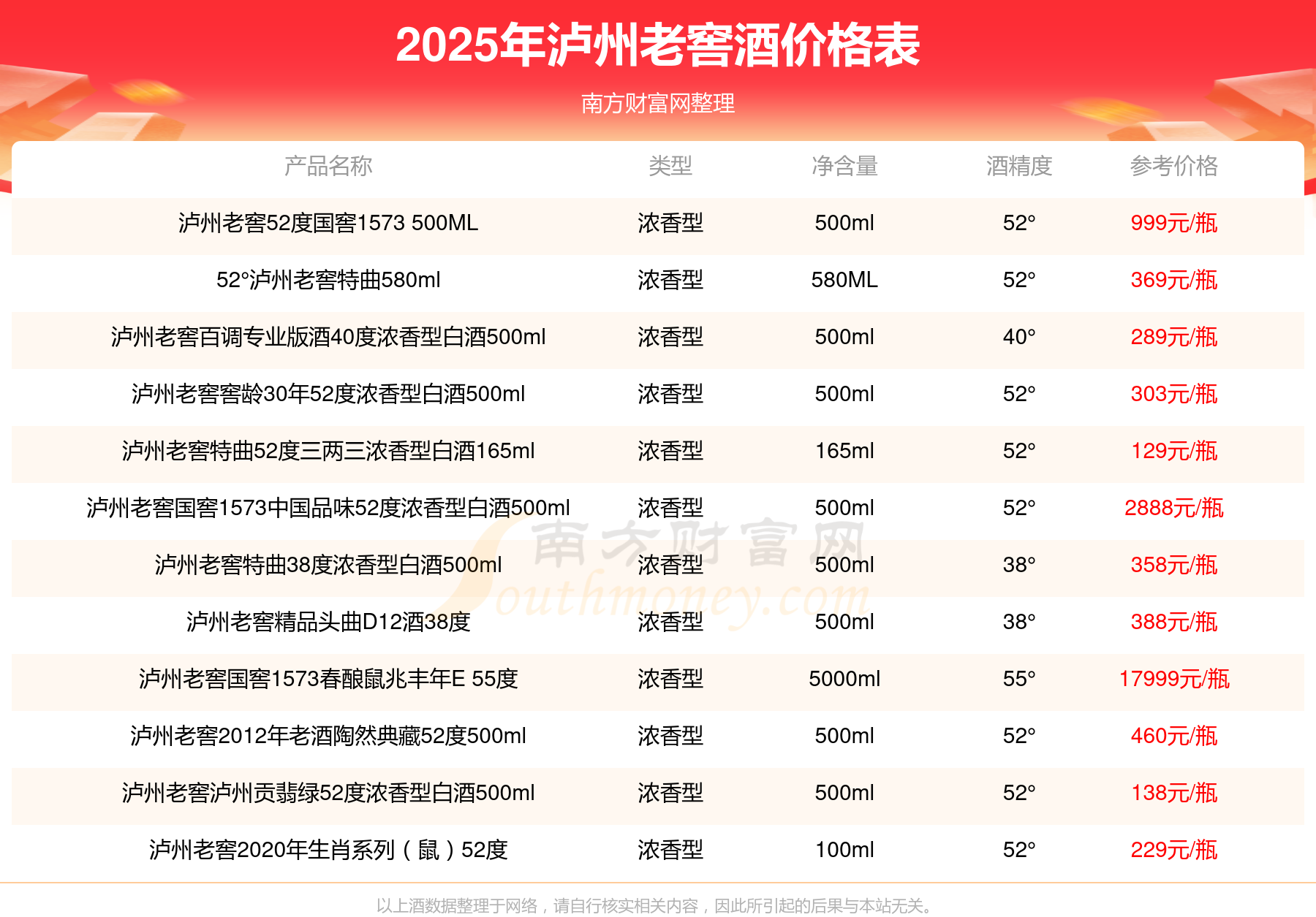 2025年瀘州老窖酒瀘州老窖國窖1573春釀鼠兆豐年E 55度、瀘州老窖國窖1573生命中的那壇酒55度014、瀘州老窖國窖1573春釀鼠兆豐年A 55度、瀘州老窖國窖1573生命中的那壇酒55度013濃香型白酒1000ml、瀘州老窖國窖1573生命中的那壇酒55度009 1000ml、瀘州老窖國窖1573中國品味52度濃香型白酒500ml、瀘州老窖國窖1573許燎源概念作品58度濃香型白酒1000ml等最新價(jià)格如下:瀘州老窖國窖1573春釀鼠兆豐年E 55度參考價(jià)17999元/瓶、瀘州老窖國窖1573生命中的那壇酒55度014參考價(jià)9999元/瓶、瀘州老窖國窖1573春釀鼠兆豐年A 55度參考價(jià)5088元/瓶、瀘州老窖國窖1573生命中的那壇酒55度013濃香型白酒1000ml參考價(jià)4988元/瓶、瀘州老窖國窖1573生命中的那壇酒55度009 1000ml參考價(jià)4288元/瓶、瀘州老窖國窖1573中國品味52度濃香型白酒500ml參考價(jià)2888元/瓶、瀘州老窖國窖1573許燎源概念作品58度濃香型白酒1000ml參考價(jià)2680元/瓶。