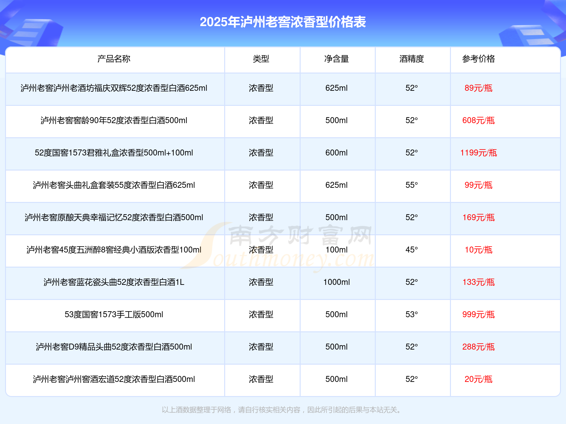 2025年,瀘州老窖國(guó)窖1573春釀鼠兆豐年E 55度、瀘州老窖國(guó)窖1573生命中的那壇酒55度014、瀘州老窖國(guó)窖1573春釀鼠兆豐年A 55度、瀘州老窖國(guó)窖1573生命中的那壇酒55度013濃香型白酒1000ml、瀘州老窖國(guó)窖1573生命中的那壇酒55度009 1000ml、瀘州老窖國(guó)窖1573中國(guó)品味52度濃香型白酒500ml、瀘州老窖國(guó)窖1573許燎源概念作品58度濃香型白酒1000ml等瀘州老窖濃香型酒參考價(jià)格如下:瀘州老窖國(guó)窖1573春釀鼠兆豐年E 55度參考價(jià)17999元、瀘州老窖國(guó)窖1573生命中的那壇酒55度014參考價(jià)9999元、瀘州老窖國(guó)窖1573春釀鼠兆豐年A 55度參考價(jià)5088元、瀘州老窖國(guó)窖1573生命中的那壇酒55度013濃香型白酒1000ml參考價(jià)4988元、瀘州老窖國(guó)窖1573生命中的那壇酒55度009 1000ml參考價(jià)4288元、瀘州老窖國(guó)窖1573中國(guó)品味52度濃香型白酒500ml參考價(jià)2888元、瀘州老窖國(guó)窖1573許燎源概念作品58度濃香型白酒1000ml參考價(jià)2680元。